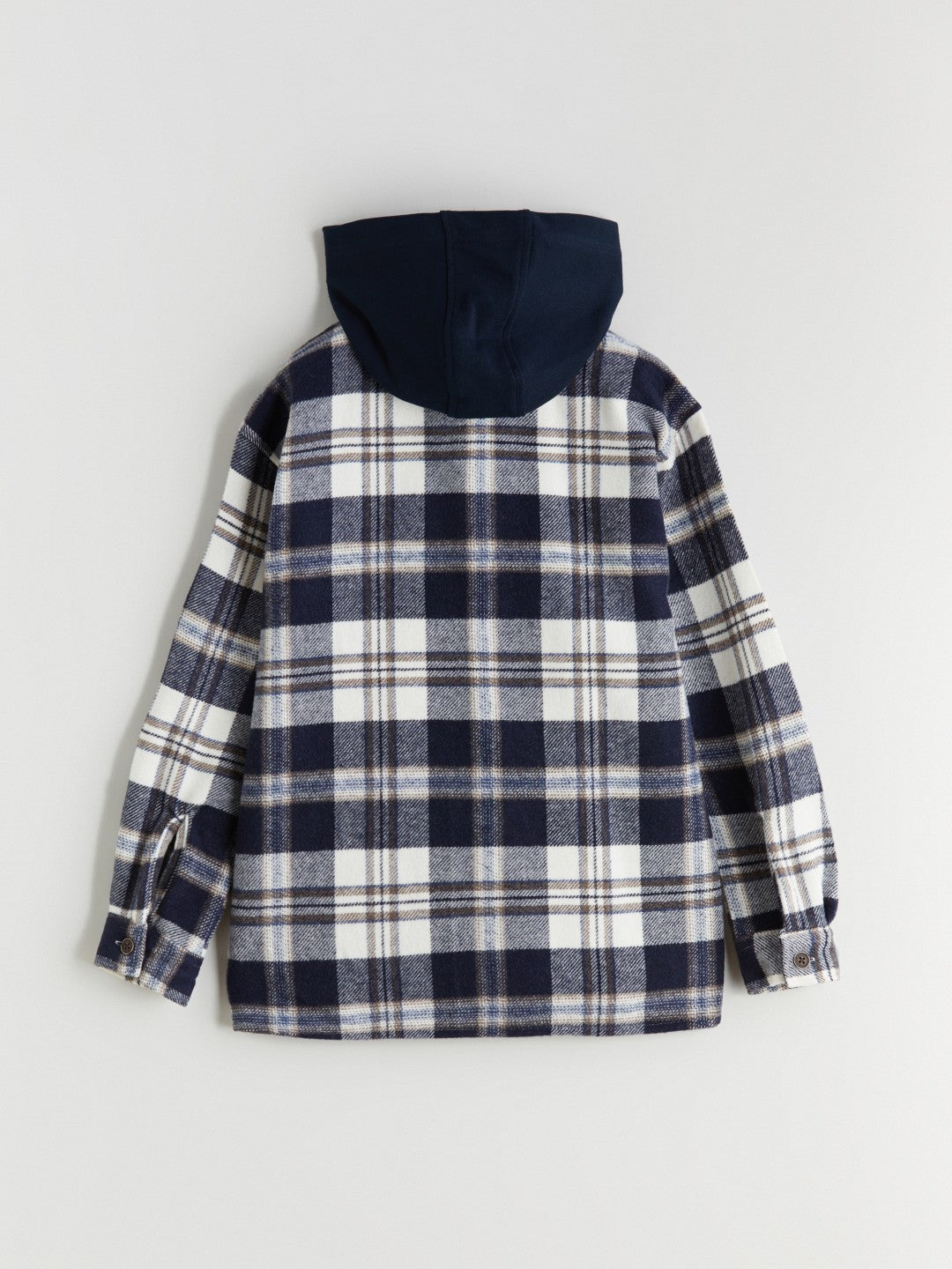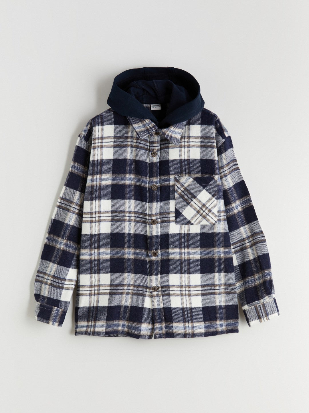 Hooded, shirt collar, long-sleeved Boys shirt with plaid pattern Made of flannel fabric, it has button closure at the front and a single chest pocket