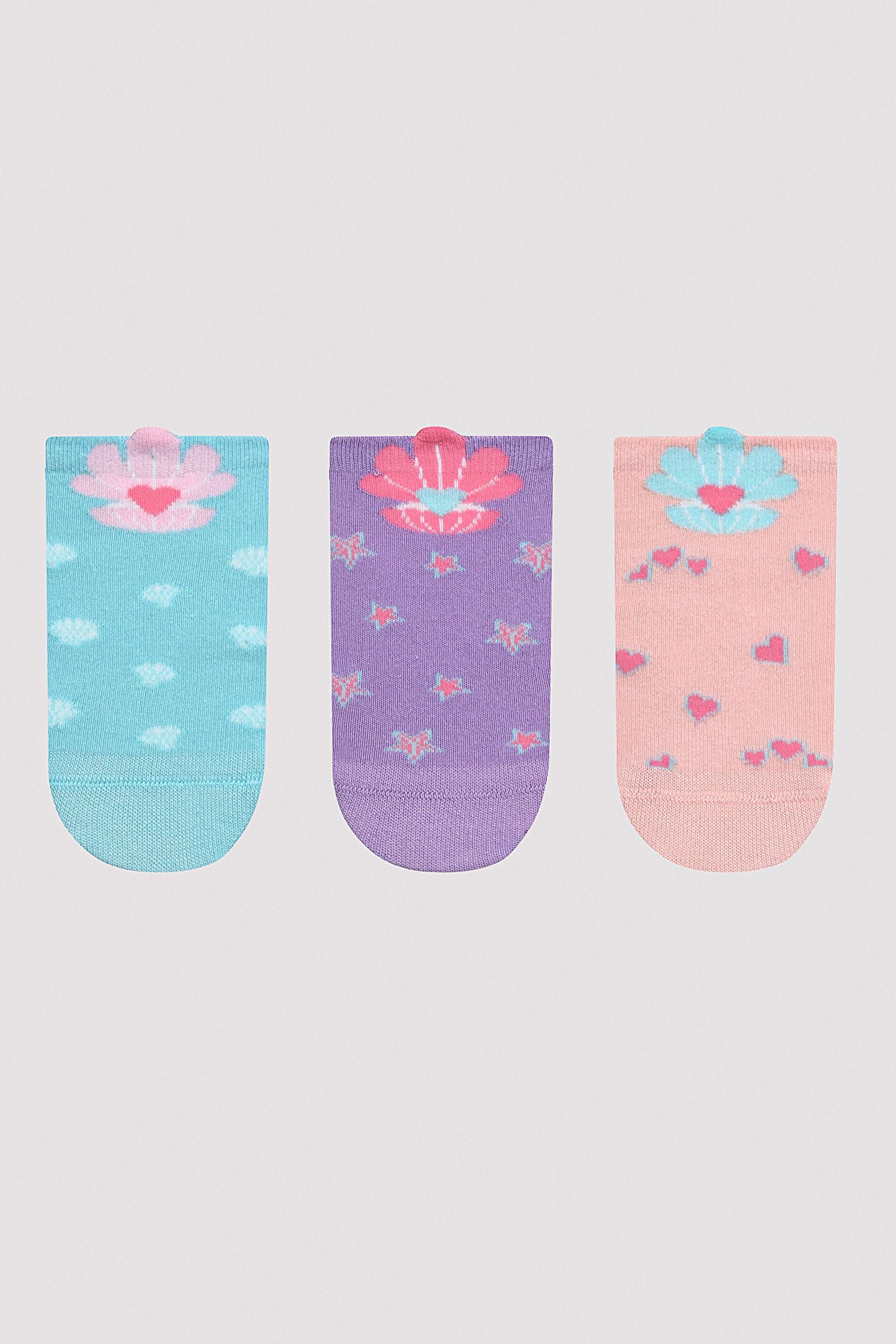 Sea Shell 3-piece Booties Socks set stands out with its pink, blue and purple colors. The blue frames of hearts and seashell figures on the pink socks will take you to the peaceful atmosphere of the sea. The white seashell figures of the blue socks will invite you to adventures in blue waters. The pink stars and blue frames of the purple socks reflect the atmosphere of the stars in the sky. Sea Shell 3-Piece Booties Socks set will accompany you at every step with its stylish design and comfortable use. Material