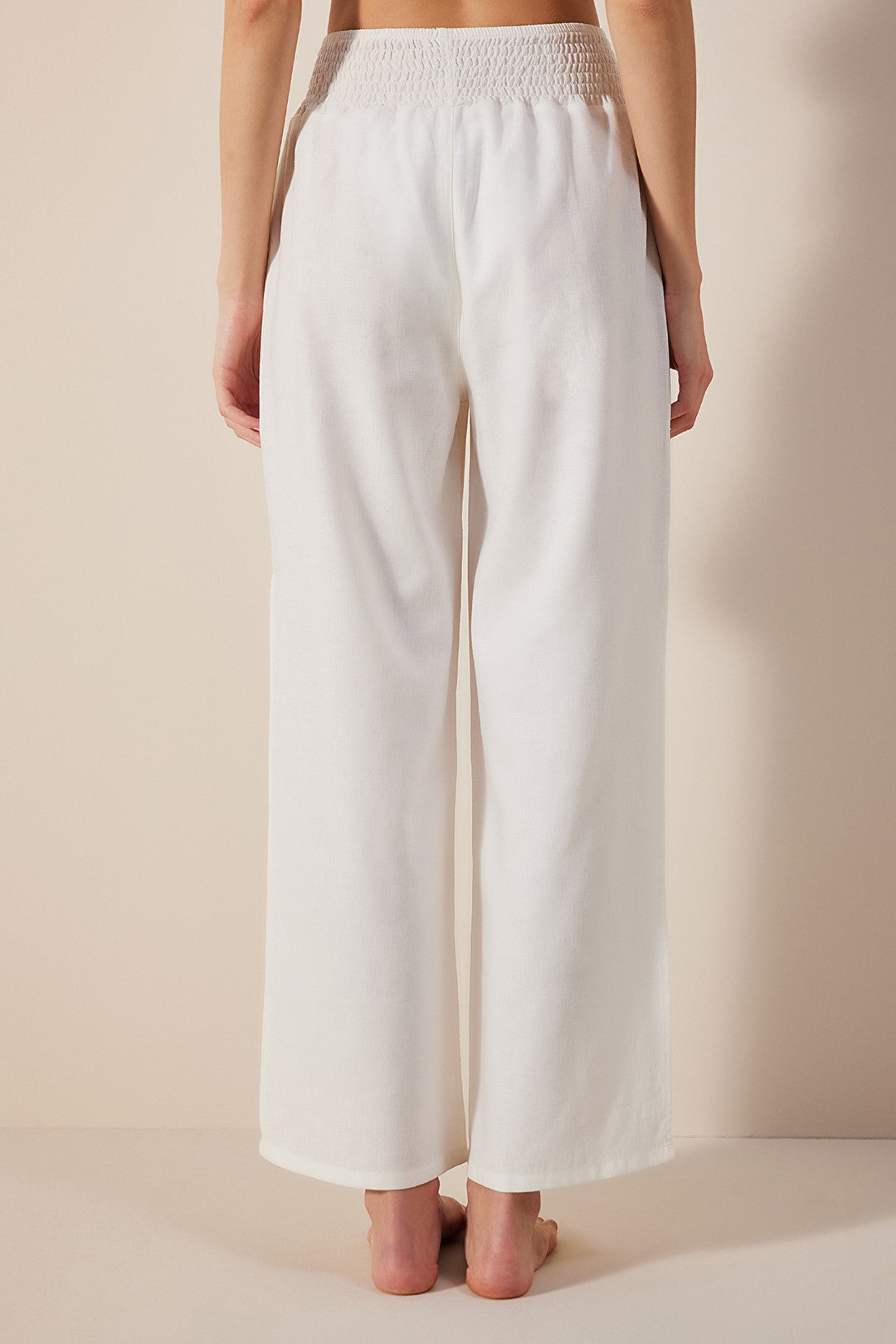 Lina Trousers are a great option to complete your elegance at the beach. Reflecting the freshness of summer with its white color, these trousers stand out with their elasticated waist and high-waisted design that offers maximum comfort. The slit detail increases mobility and provides comfort with its maxi length. Buy these trousers now, ideal for reflecting your style when going to the beach! The measurement of the model in the image is Size S, Height 181 cm, Chest 84 cm, Waist 61 cm, Hip 90 cm