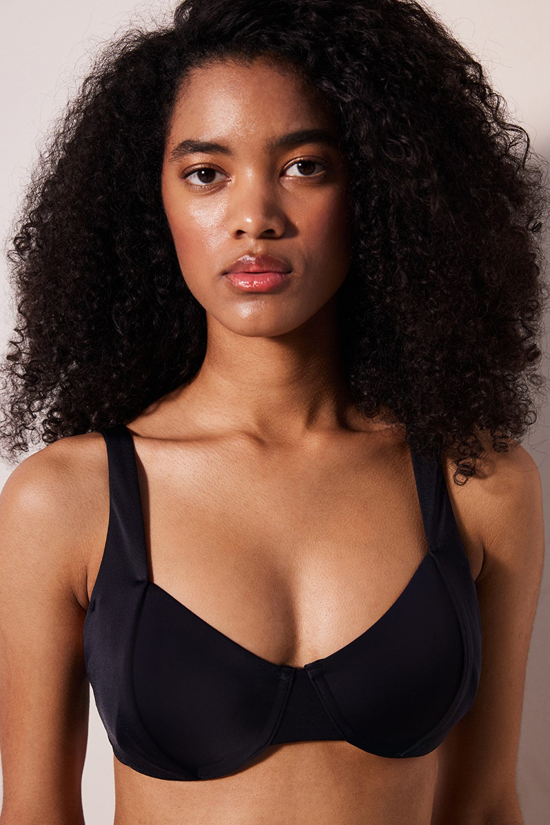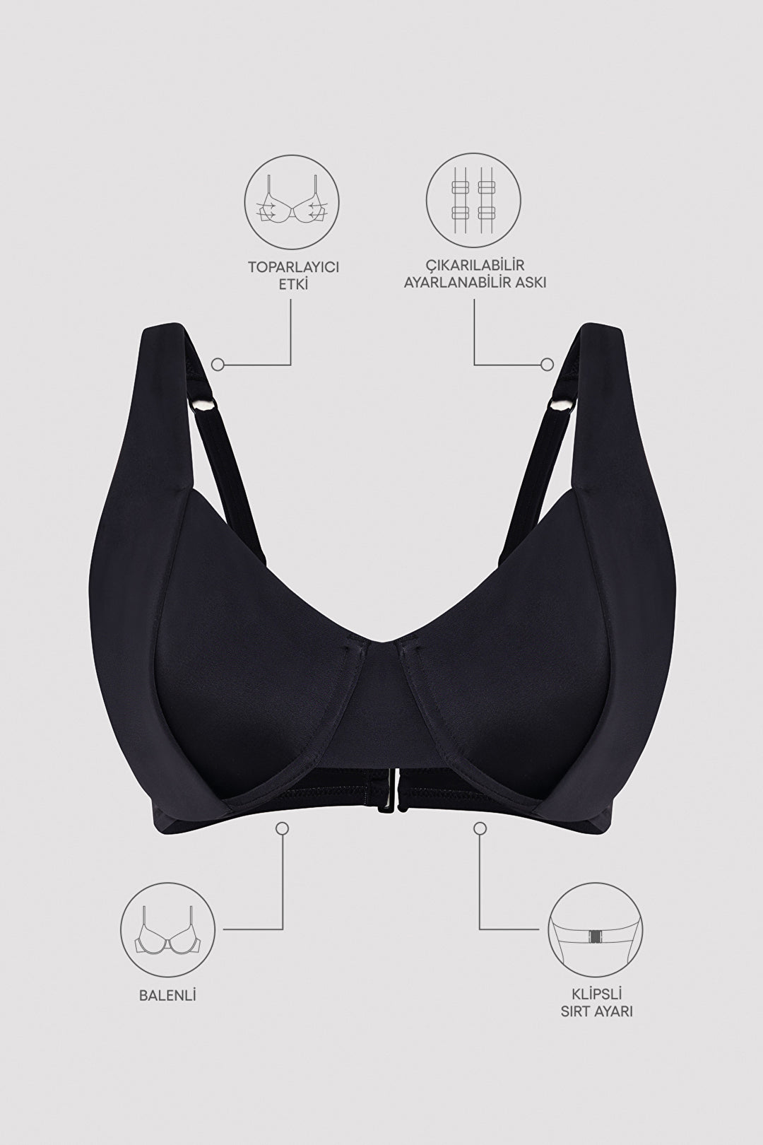 Basic New Underwire Top is a bikini top that combines elegance and comfort. It suits every taste with its black design. Its underwire structure provides support for your breasts, while its fixed and adjustable straps allow you to use it as you wish. It makes you feel both stylish and comfortable with its hooked back detail and removable pads. Be the star of the beach with Basic New Underwire Top! Buy now and enjoy your summer vacation! The measurement of the model in the image is Size S, Height 180 cm, Chest 83 cm, Waist 65 cm, Hip 89 cm
