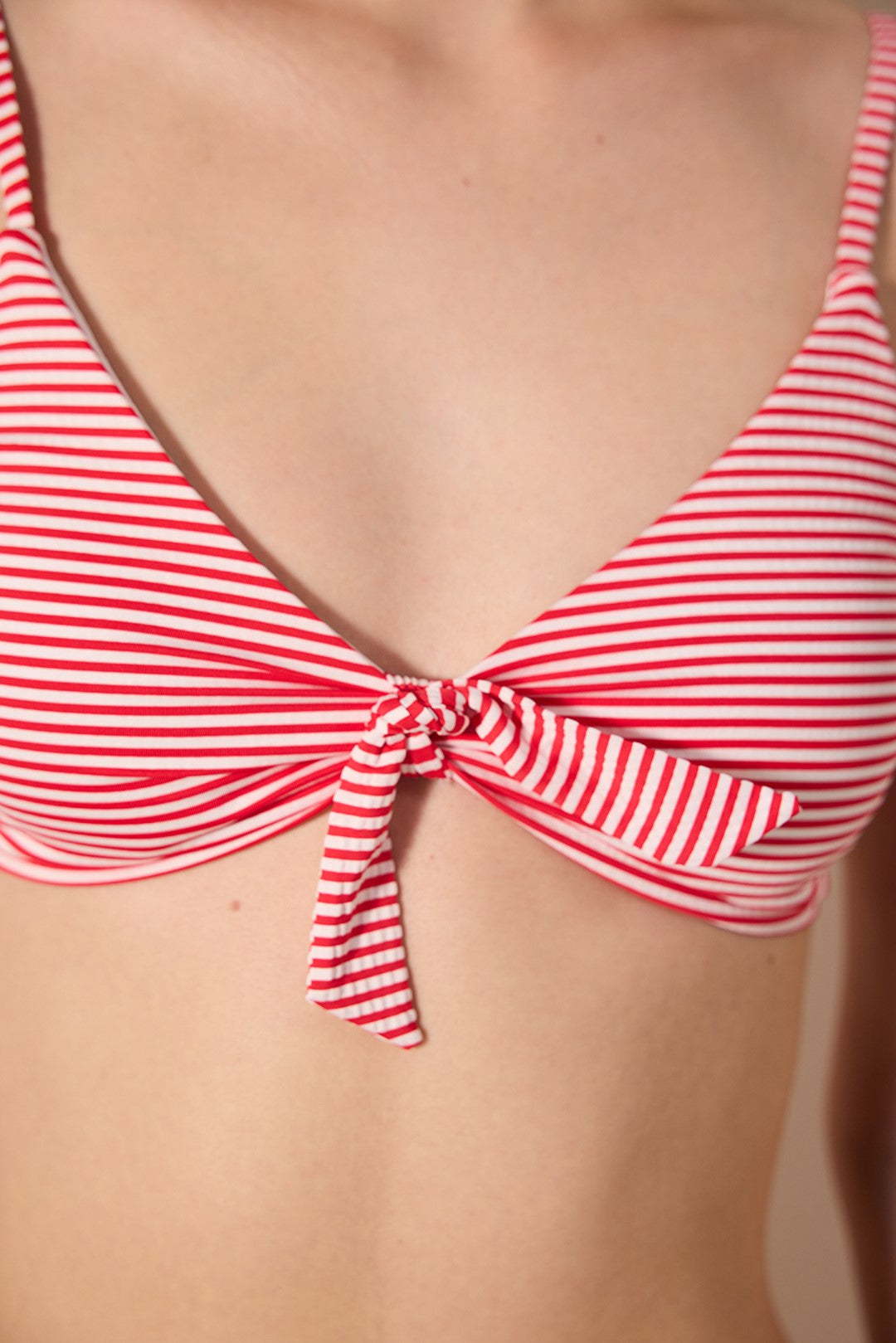 Patmos Triangle Knot Top offers a stylish option to complement your beach style. It stands out with its red-white striped pattern and textured fabric. While it offers comfortable use with its non-wired design, it can be adjusted to suit your body thanks to its fixed and adjustable straps. It can be shaped as desired with its removable pads. The hooks on the back detail provide ease of use. Discover Patmos Triangle Knot Top now and be the star of the beach! The measurement of the model in the image is Size S, Height 179 cm, Chest 84 cm, Waist 59 cm, Hip 90 cm