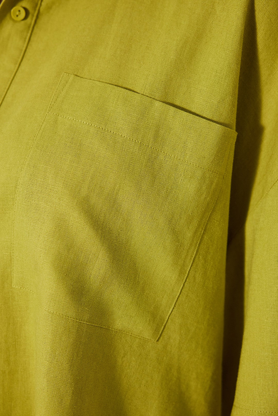 Natural Shirt brings together freshness and elegance with its green tone. While it offers freedom of movement with its short sleeves and midi length, it emphasizes elegance with its buttoned structure and shirt collar. It easily adapts to every style. It is an ideal option for those who want to achieve both a comfortable and stylish look. Enjoy your natural and elegant look, complete your style with the Natural Shirt! The measurement of the model in the image is Size S, Height 181 cm, Chest 84 cm, Waist 61 cm, Hip 90 cm