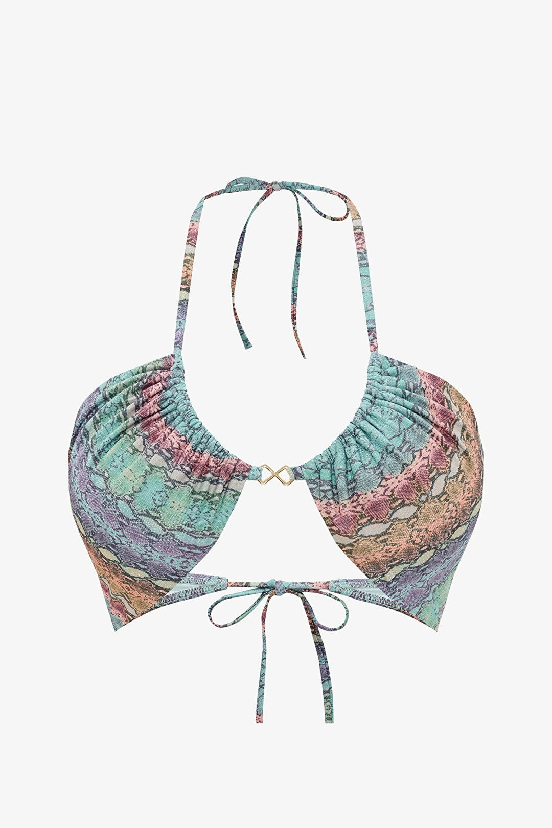 The Aida Reverse V Top is a stylish bikini top made with sustainable production and eco-friendly design. Its glittery and snake-patterned design adds a touch of elegance to your style, while its loop accessory details add a touch of elegance. Made with a water-saving digital printing technique, this product allows you to make an environmentally responsible choice. Its underwire-free design offers comfort and convenience. The halter straps and back tie feature allow you to customize the fit to your personal preferences. Removable pads also provide extra comfort and convenience. The Aida Reverse V Top offers both style and comfort.