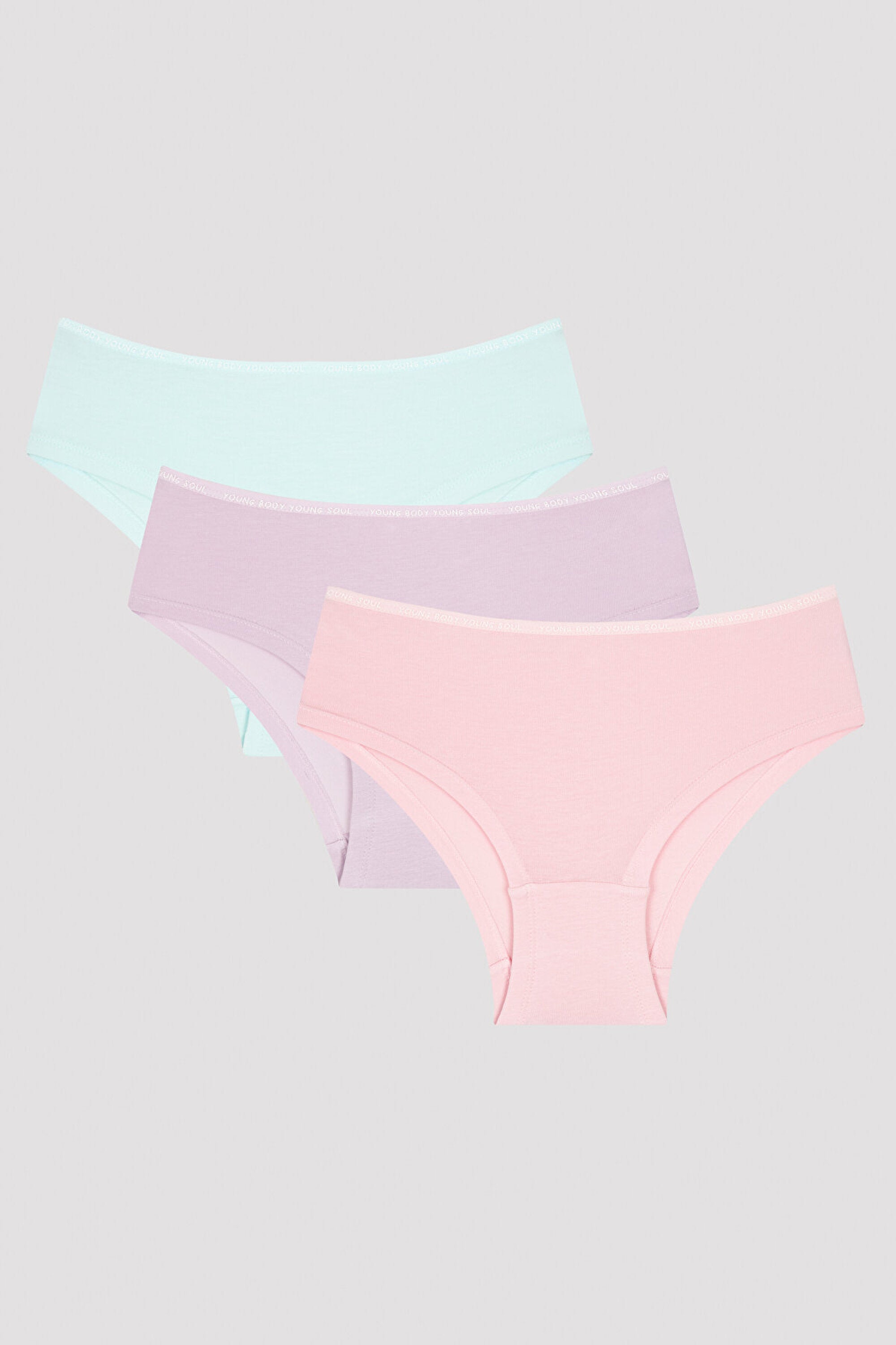 Soft Pastel 3-Piece Hipster Panties in purple, blue and pink colors that add movement and fun to girls' underwear style with the stripe detail on the waist. Material