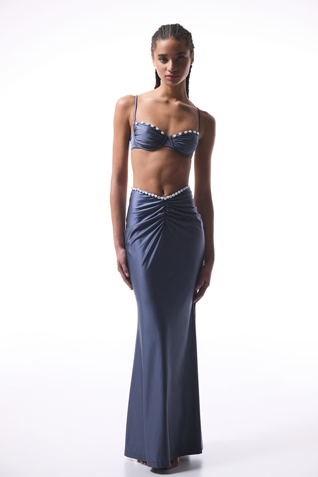 Seashell Dark Shirred Skirt brings together elegance and chic. It matches many combinations with its gray color and stands out with pearl accessories. It offers elegance thanks to its fitted structure that fits the body. The pearl details of this midi skirt add an elegant touch to the skirt. Its high waist hugs and gathers the waist. Take your style to the next level by adding this stylish piece to your collection. Buy now and add elegance to your style!