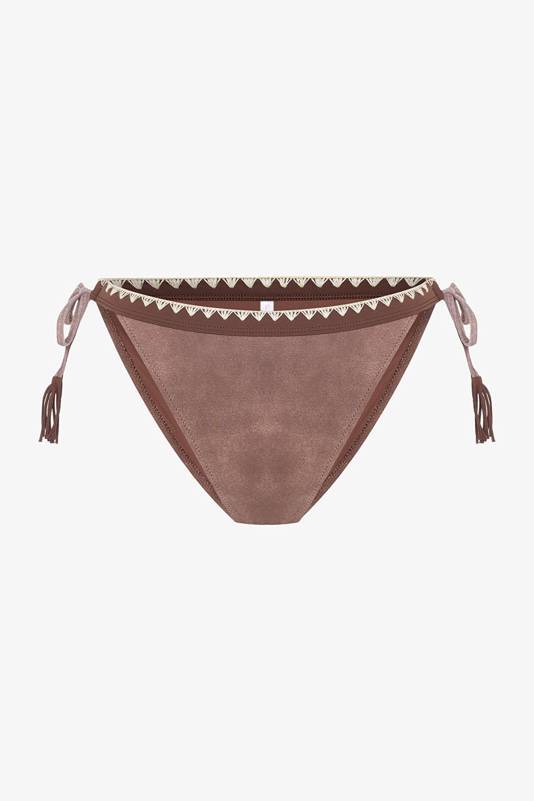 Emery Bikini Bottom is a must-have piece in your collection with its plain brown color. This bikini bottom stands out with its tassel accessories and crochet details. This product, which has a low-waist design, has a slight coverage at the back. It can be easily combined with different tops, so you can personalize your beach style as you wish. Show off your style on the beach with Emery Bikini Bottom and add this piece to your wardrobe!