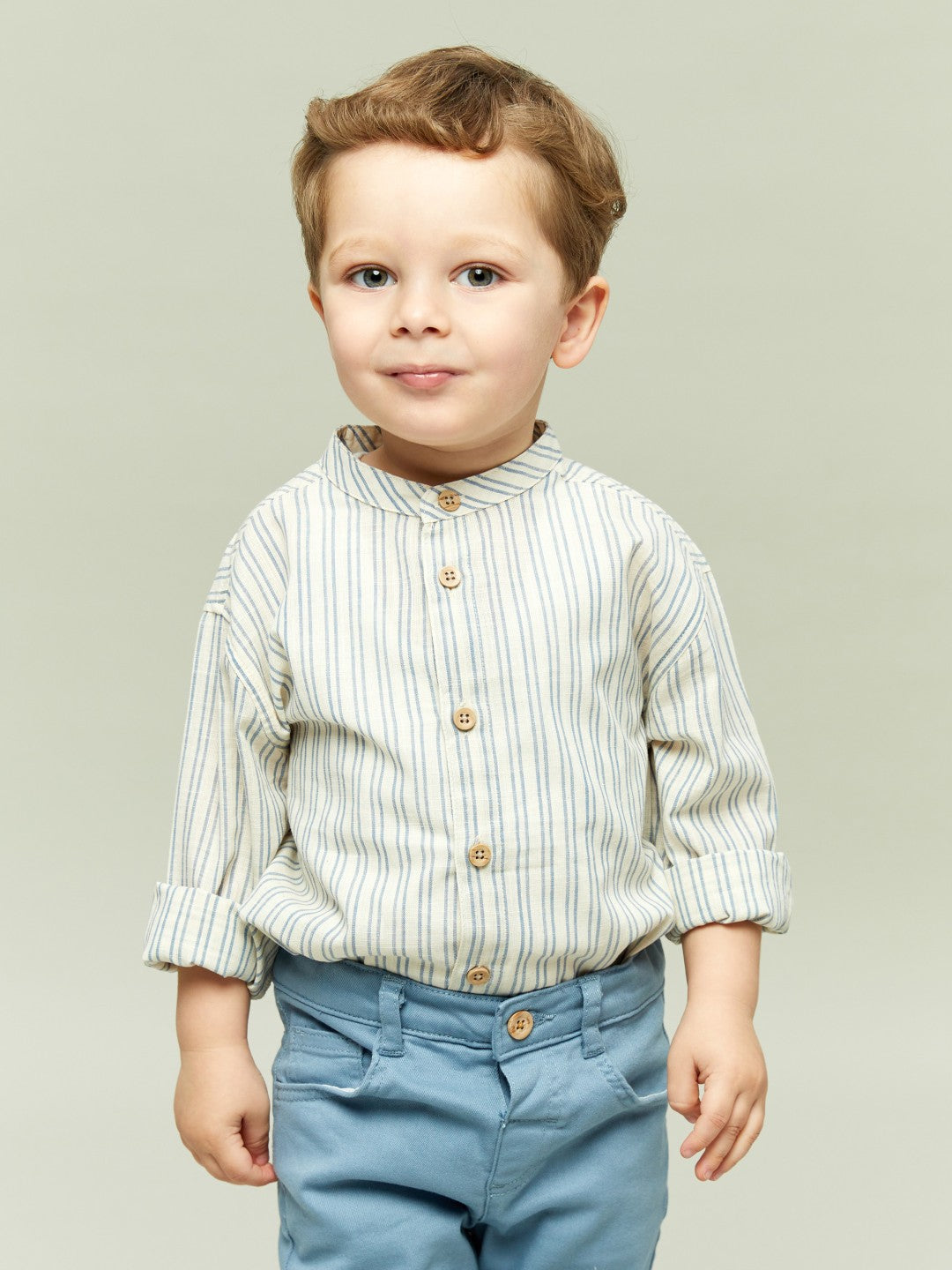 Stylish and comfortable striped baby boy suit, long-sleeved shirt and trouser duo made of poplin fabric, ideal for daily use. It adds elegance with its buttoned detail.