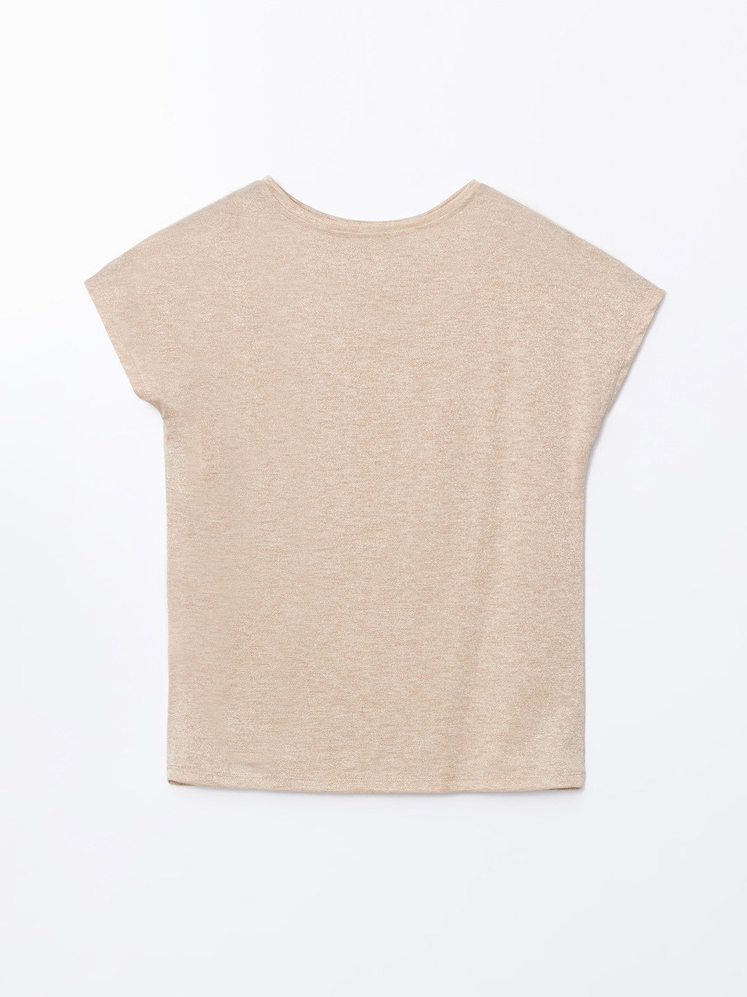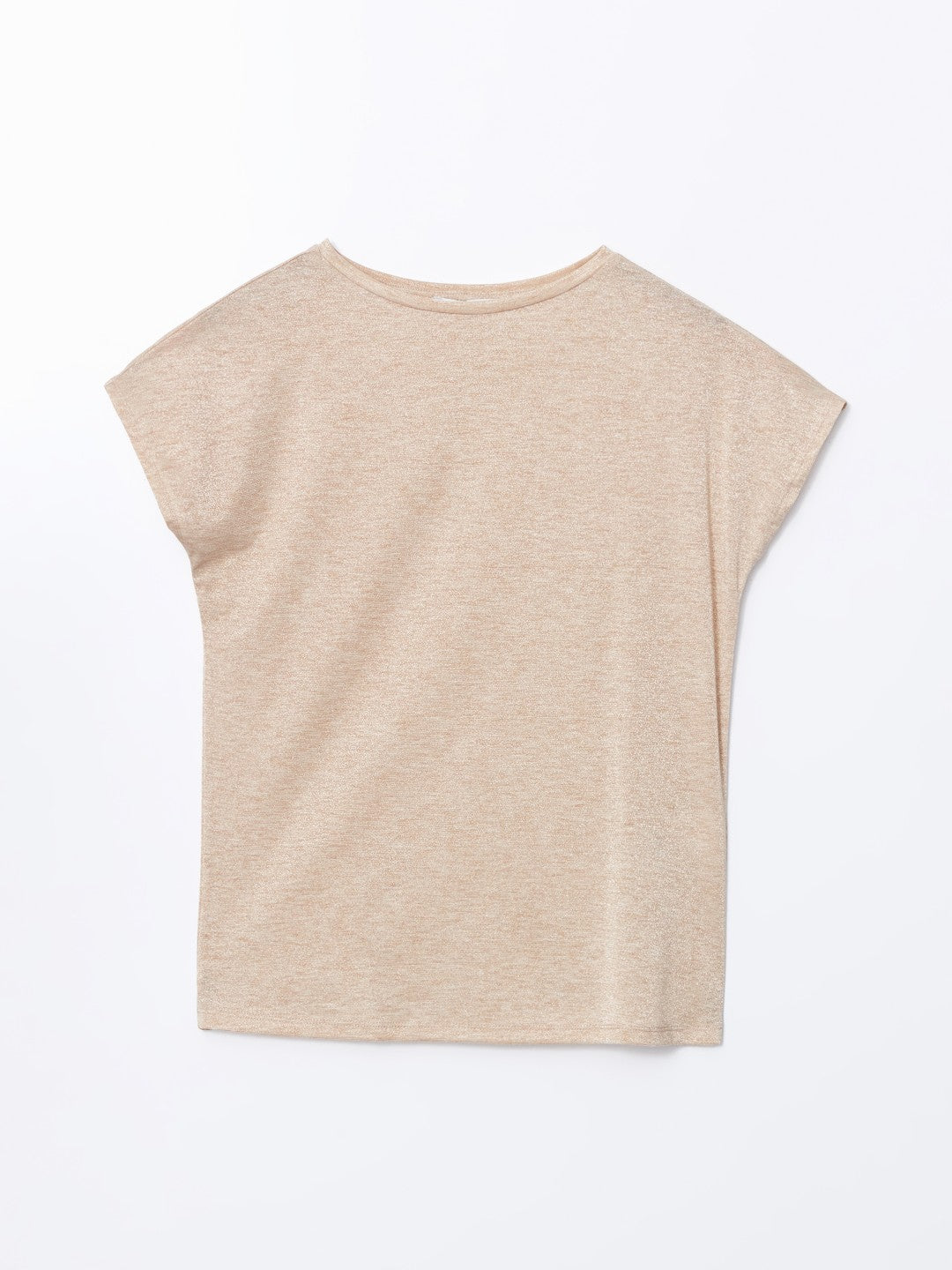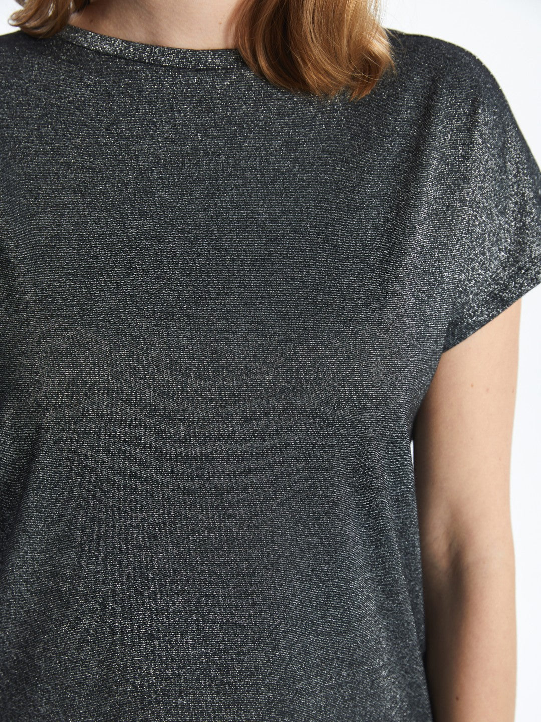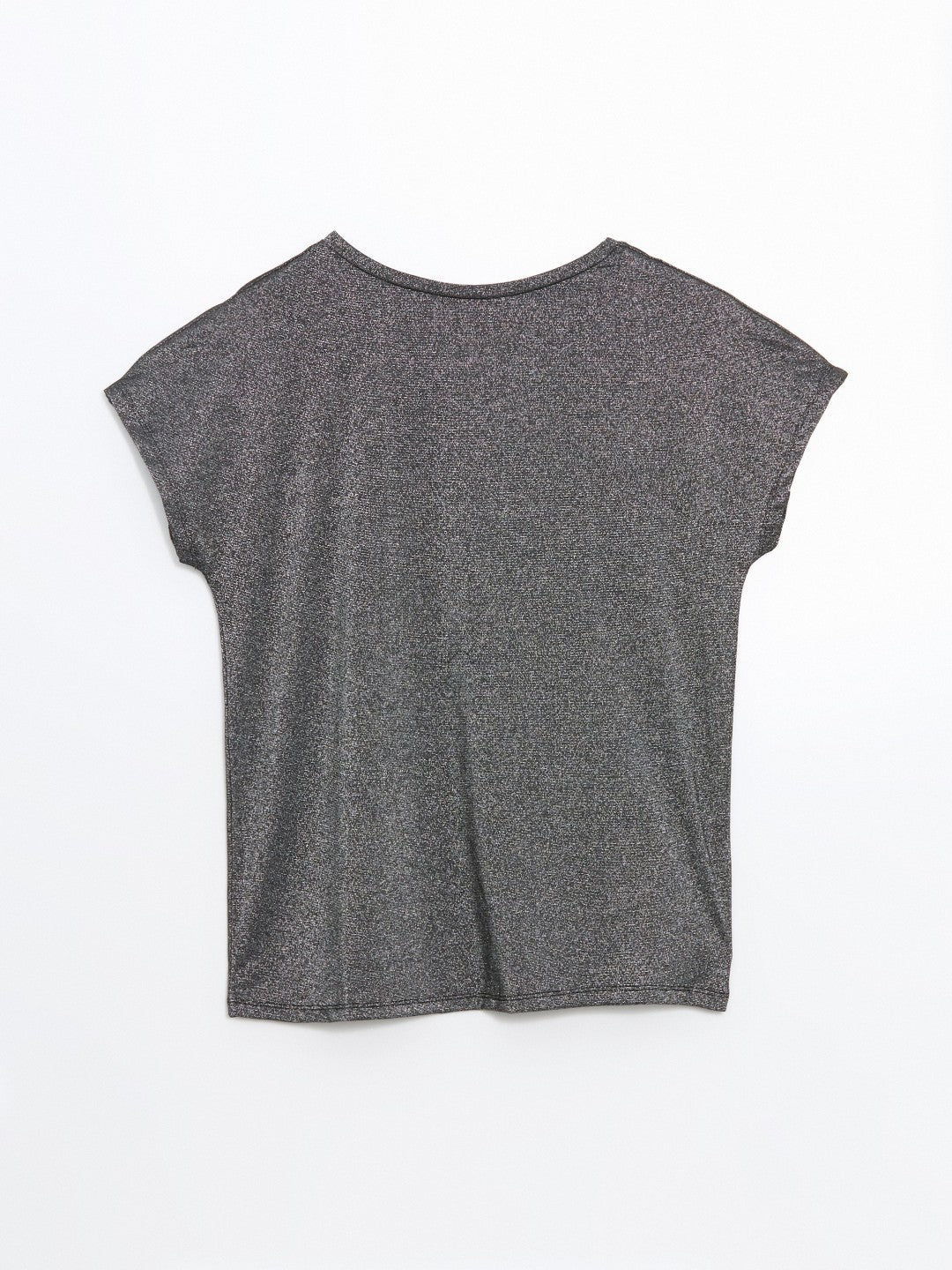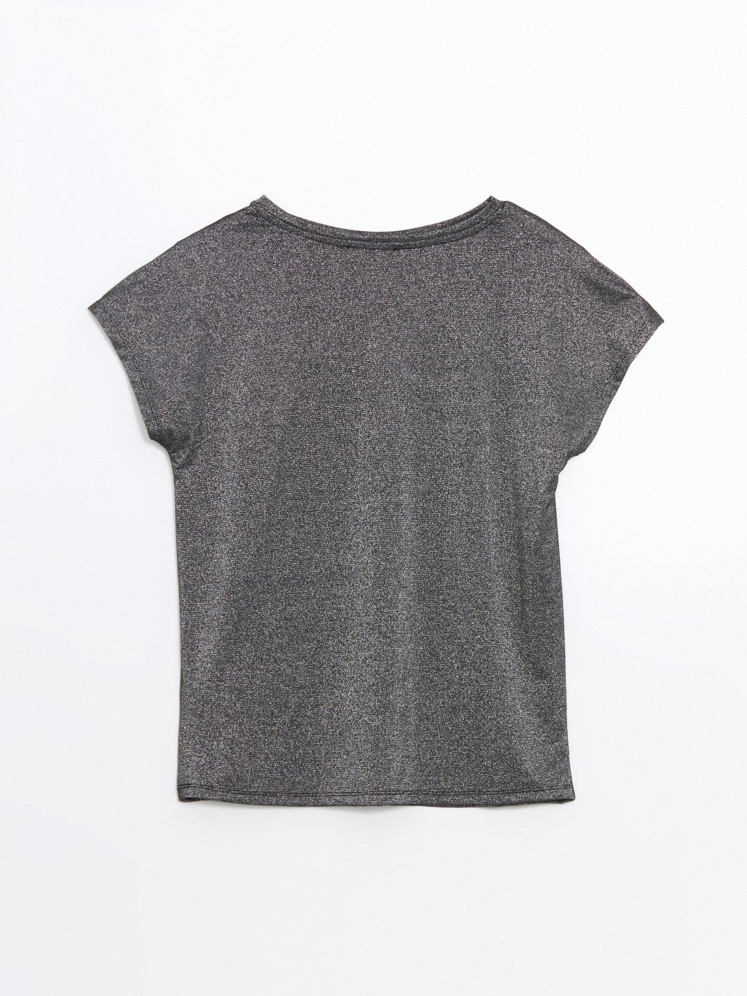 High collar, shiny looking short sleeve T-shirt, made of single jersey fabric with a metallic yarn blend. It draws attention with its glittery appearance.