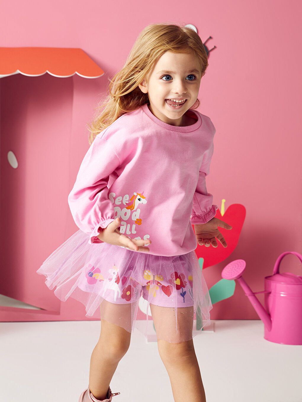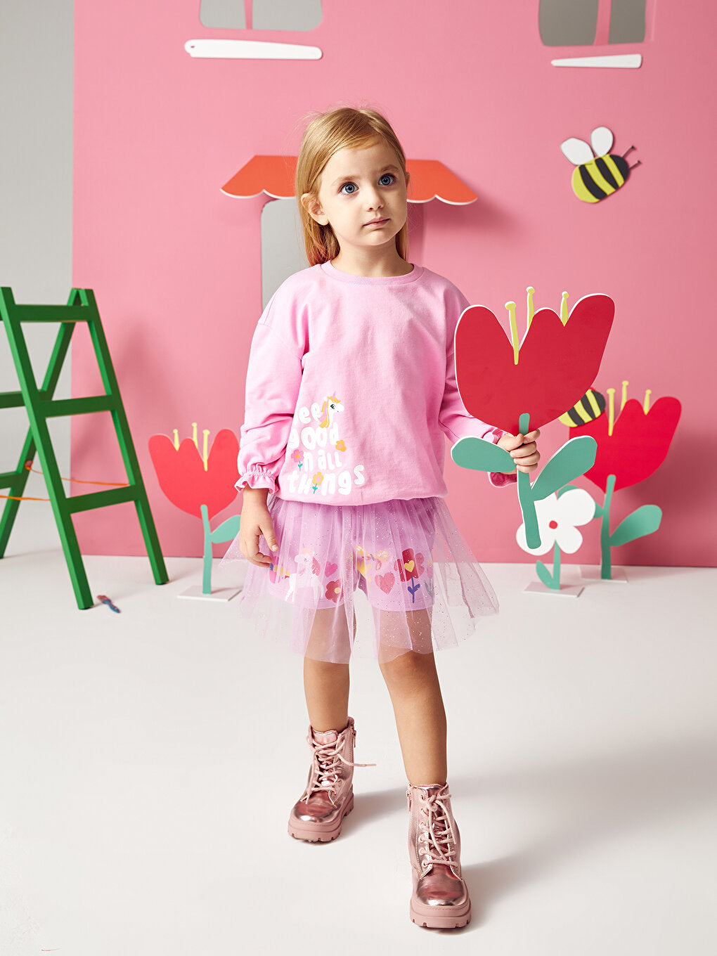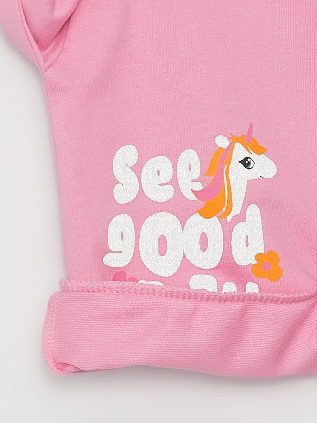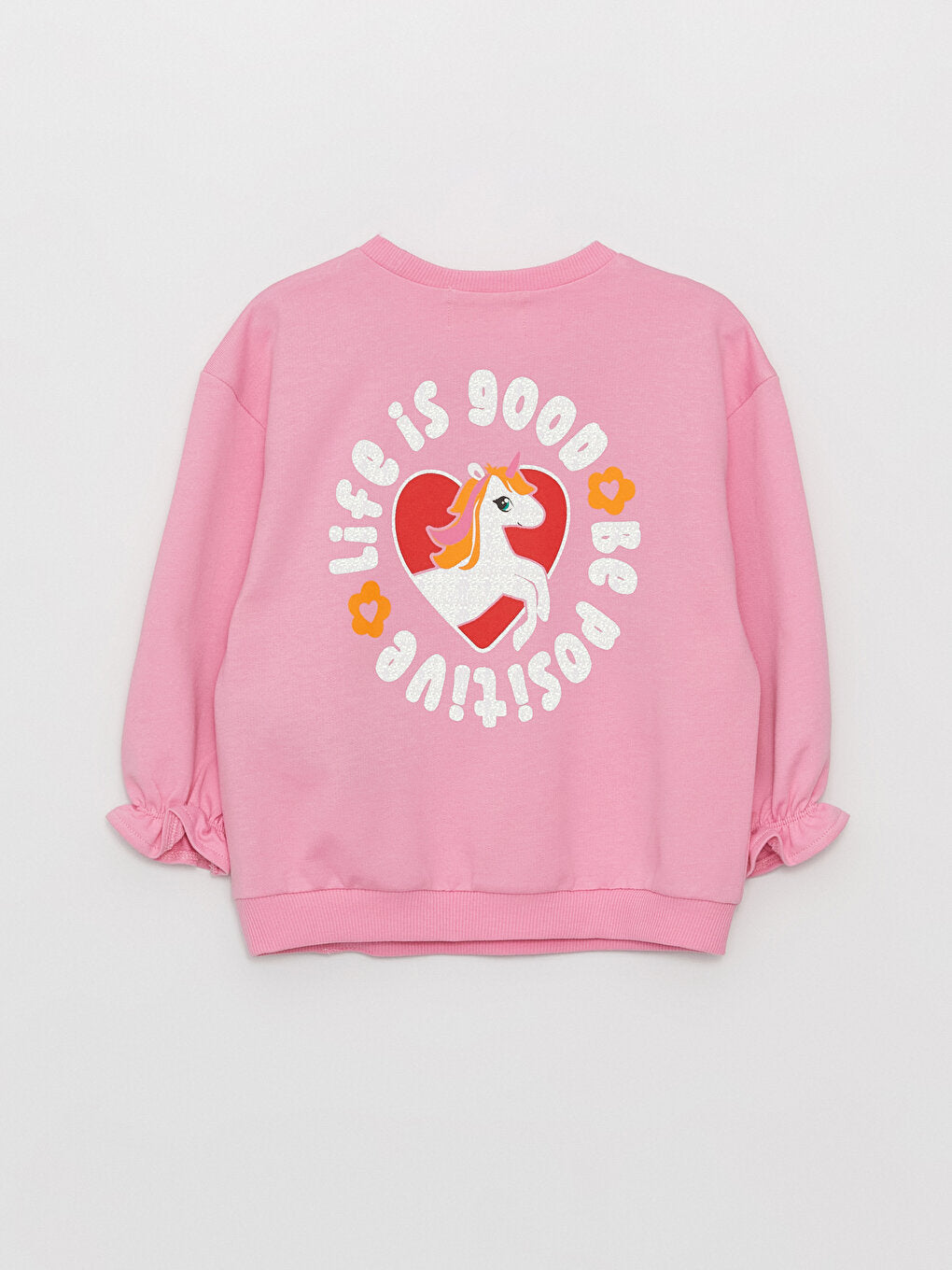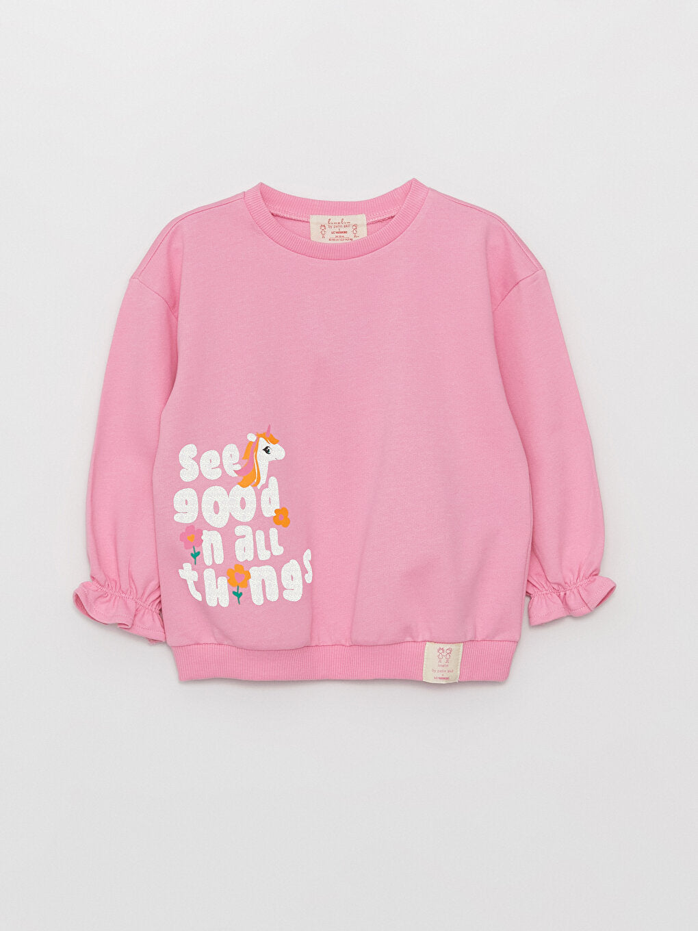 Drawing attention with its glittery print on the front and cheerful prints on the back, the baby girl sweatshirt provides comfort with its ribbed details on the cuffs and hem. The crew neck design complements the elegant style of the little ones.