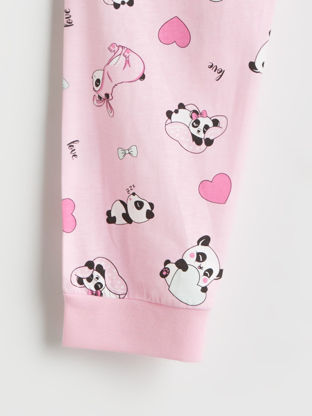 This girls crew neck pajama set is made of cotton. It consists of a long-sleeved top with a panda print and elasticated waist bottoms.