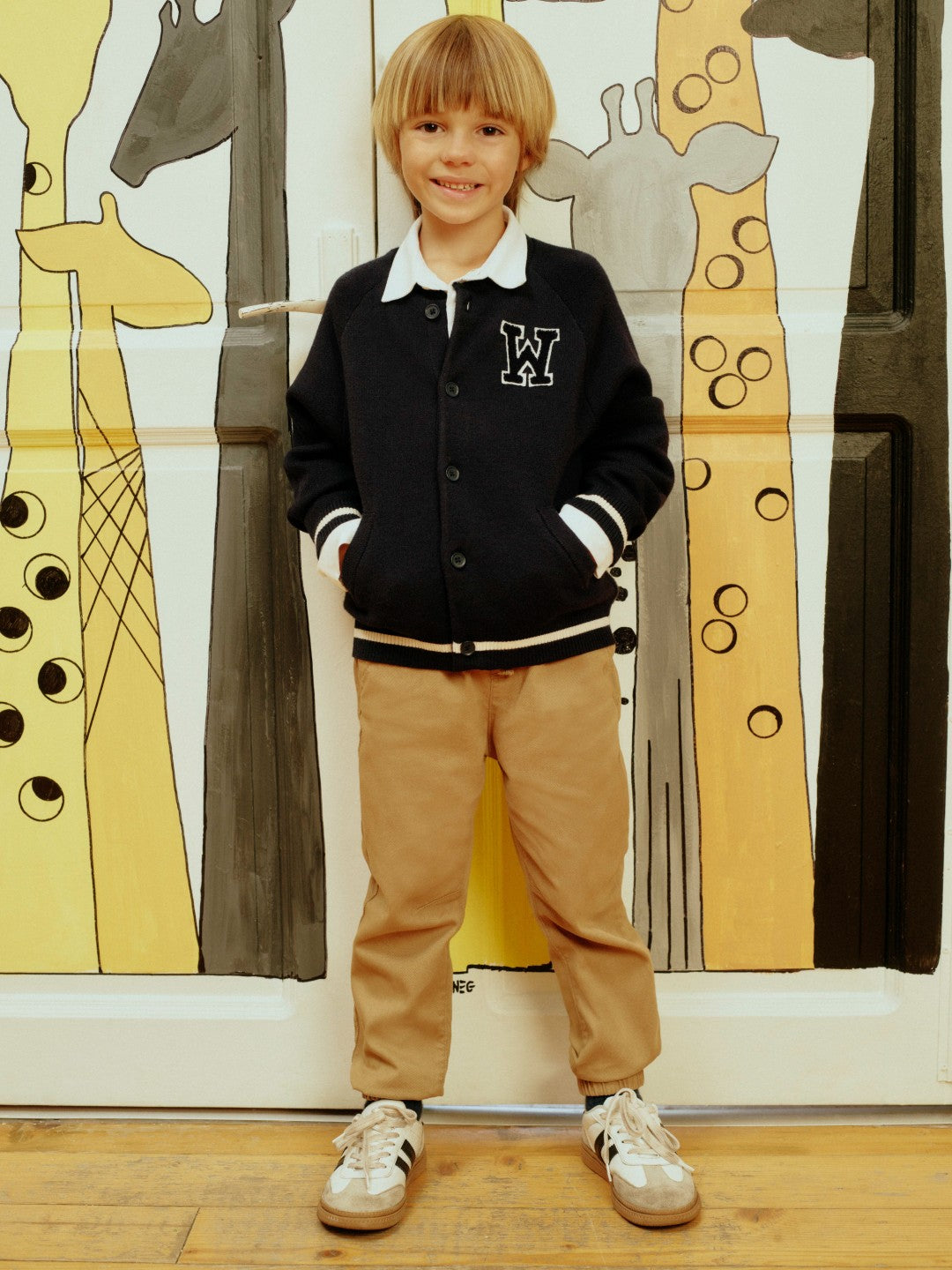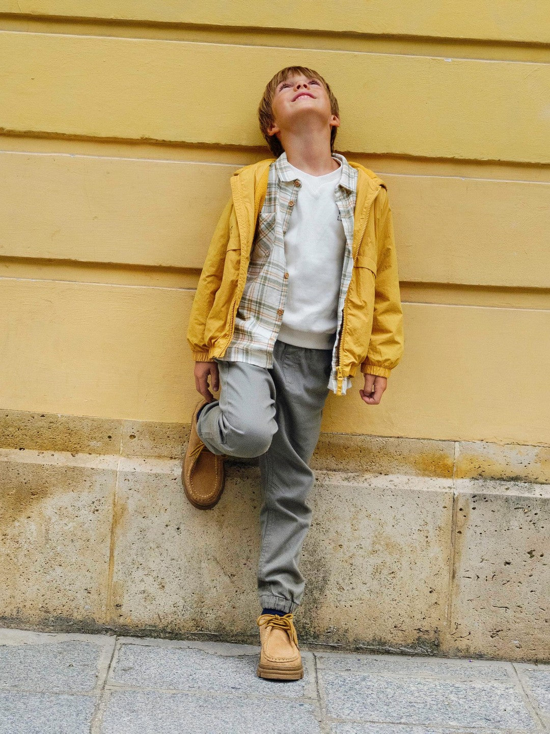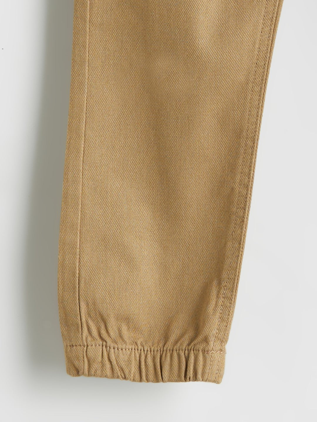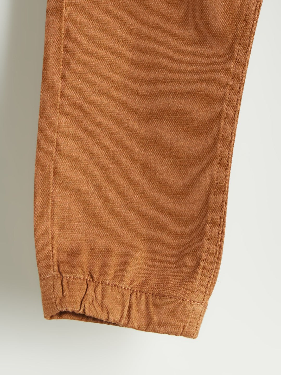 Standard fit boys trousers are made of dobby fabric. They have elasticated waist and legs, lace-up closures, and pockets.