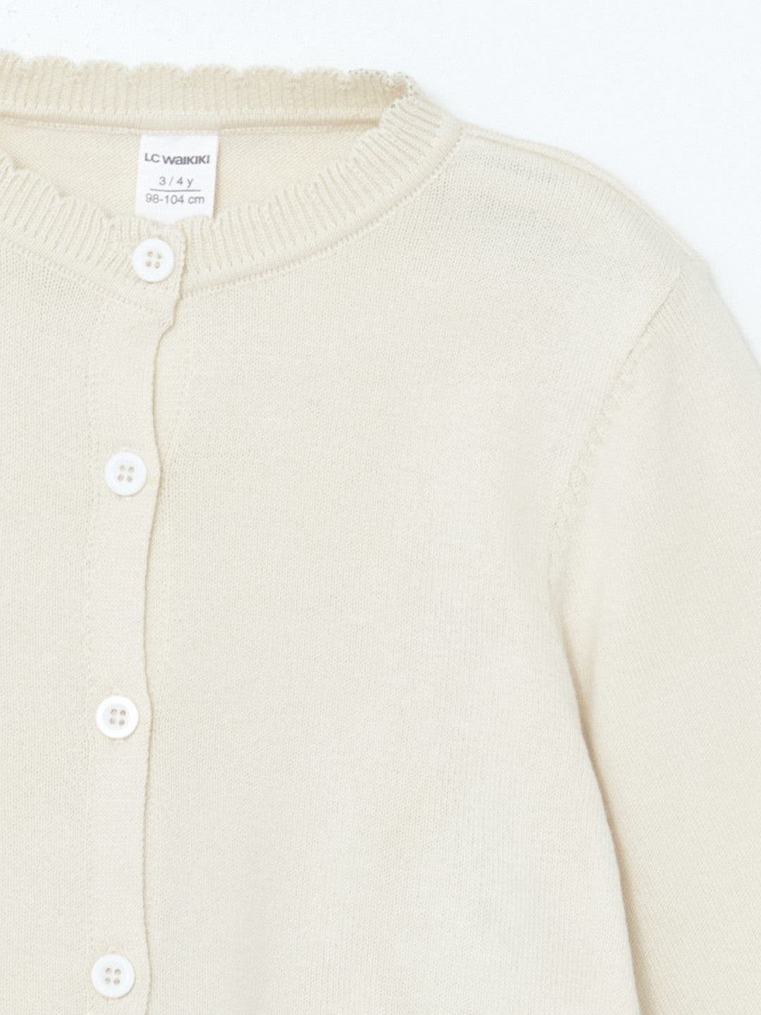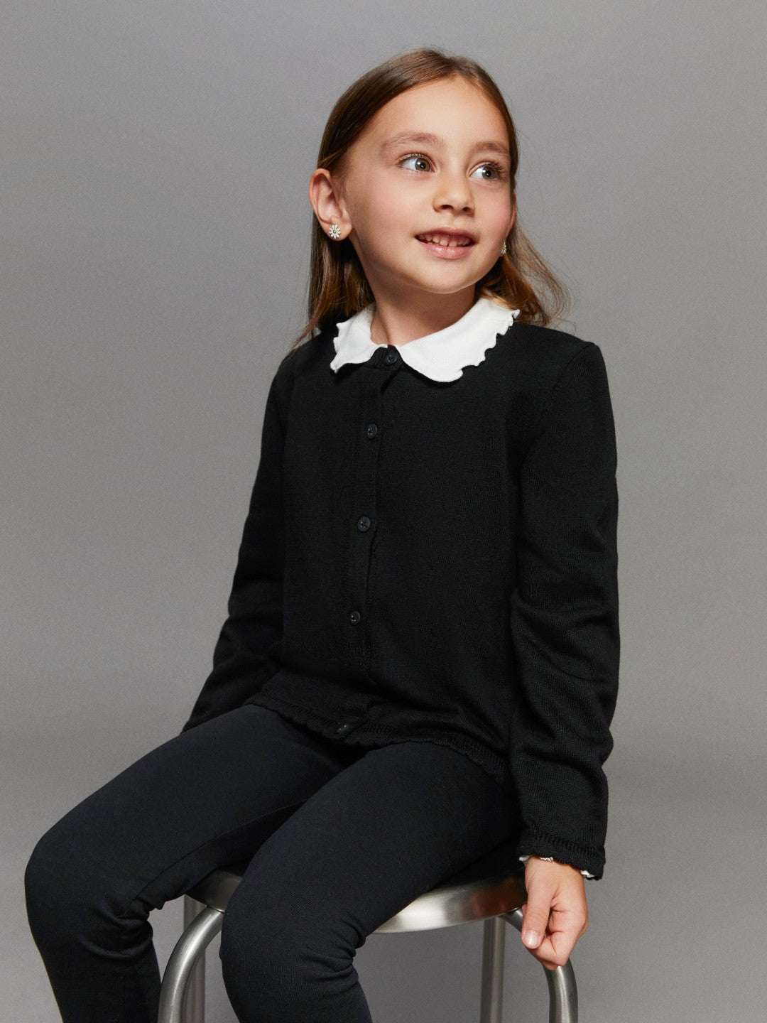 This girls crew neck cardigan is made of knitwear. It features a ruffle design on the sleeve ends and bottom.