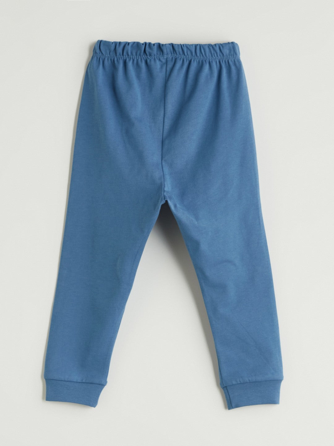 This car-printed baby boy pajama set is made of cotton fabric. It consists of a crew neck pajama top and elastic waist jogger pajama bottoms.