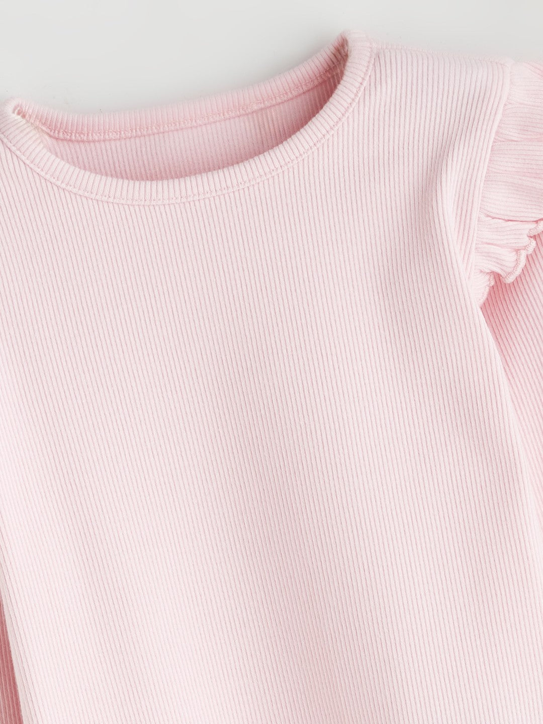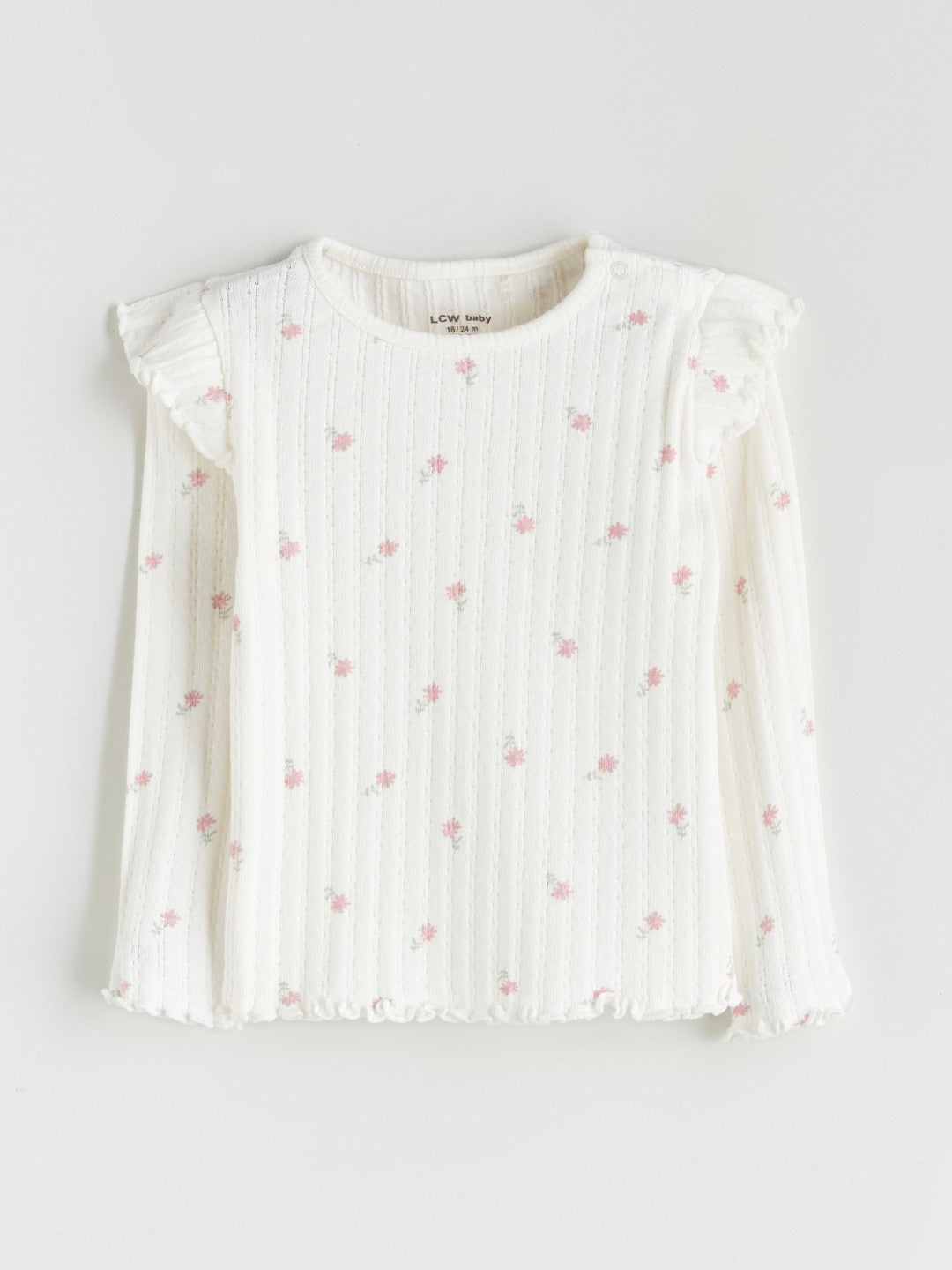 3-pack crew neck t-shirt for baby girls made of stretchy cotton fabric. It features a plain and floral pattern with ruffle details.