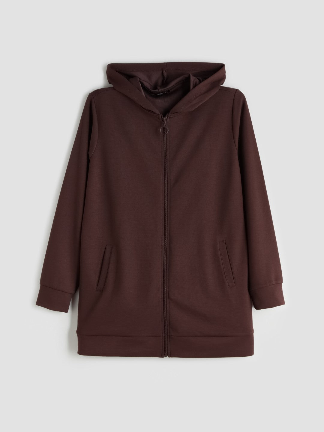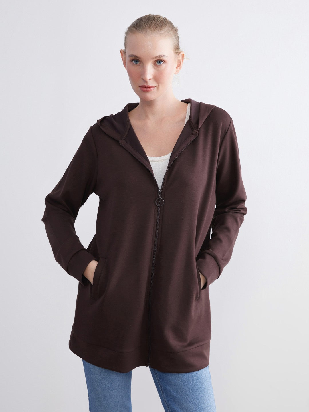 This long-sleeved, hooded women sweatshirt is made of scuba fabric. It features a front zipper and ribbing at the ankles and bottom.