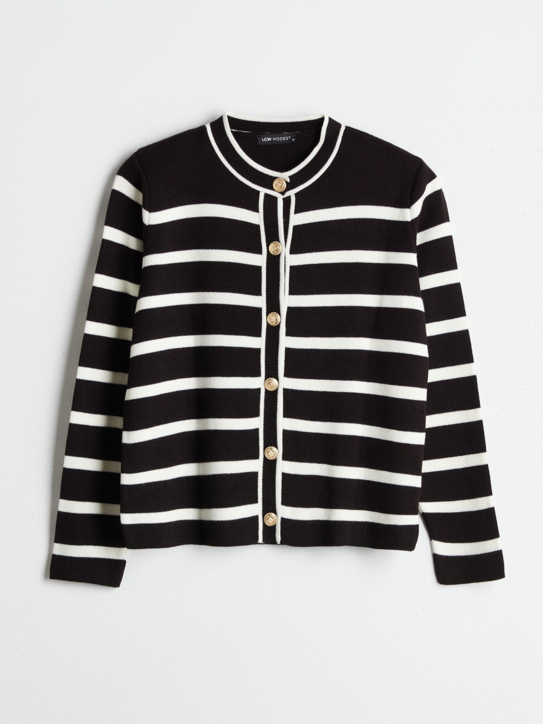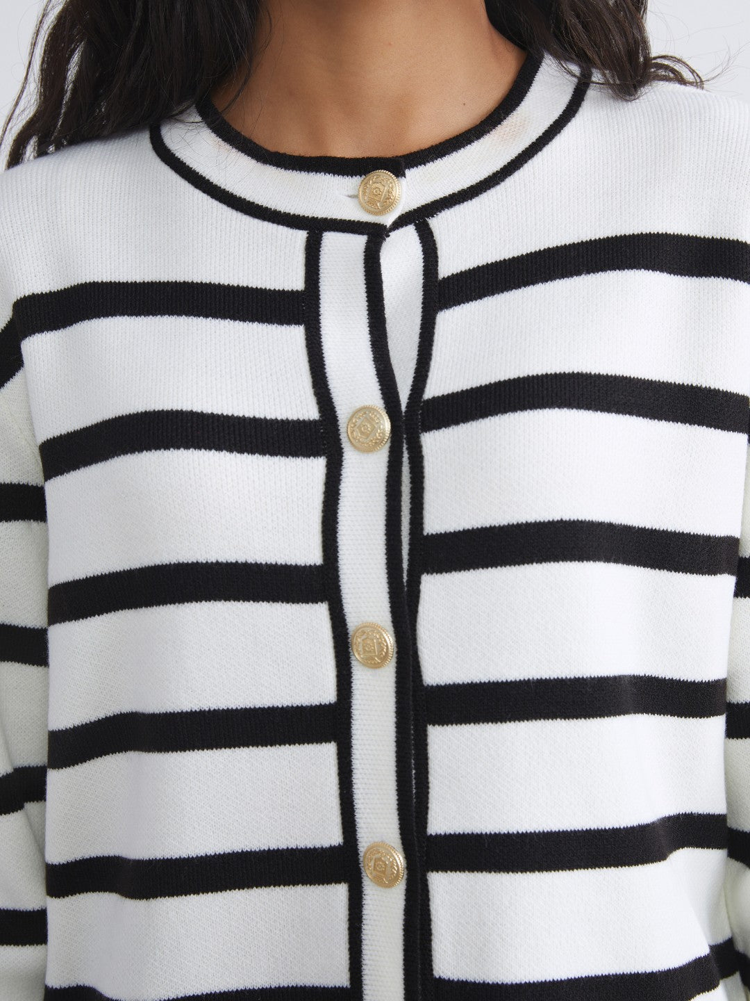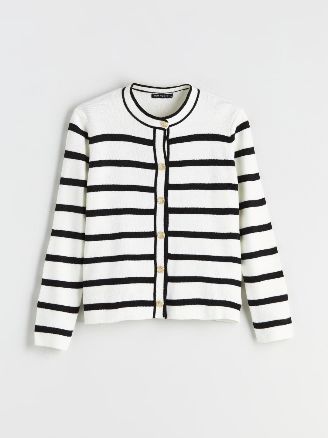 Women cardigan with a crew neck, long sleeves and striped pattern is made of medium-thick knitwear fabric and has a button-down front.