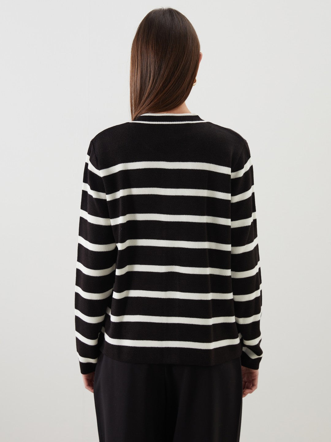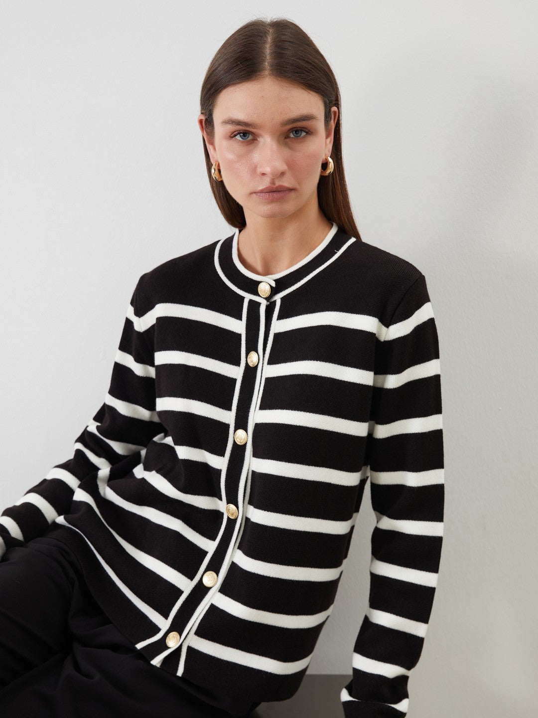 LCW Modest Black Crew Neck Striped Women Knitwear Cardigan
