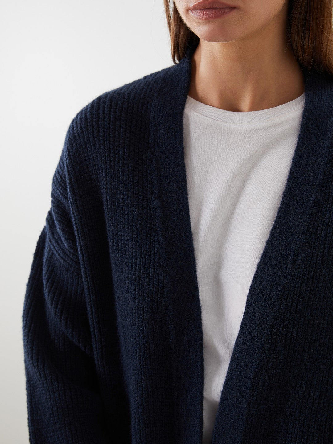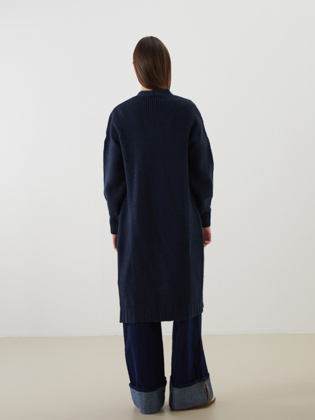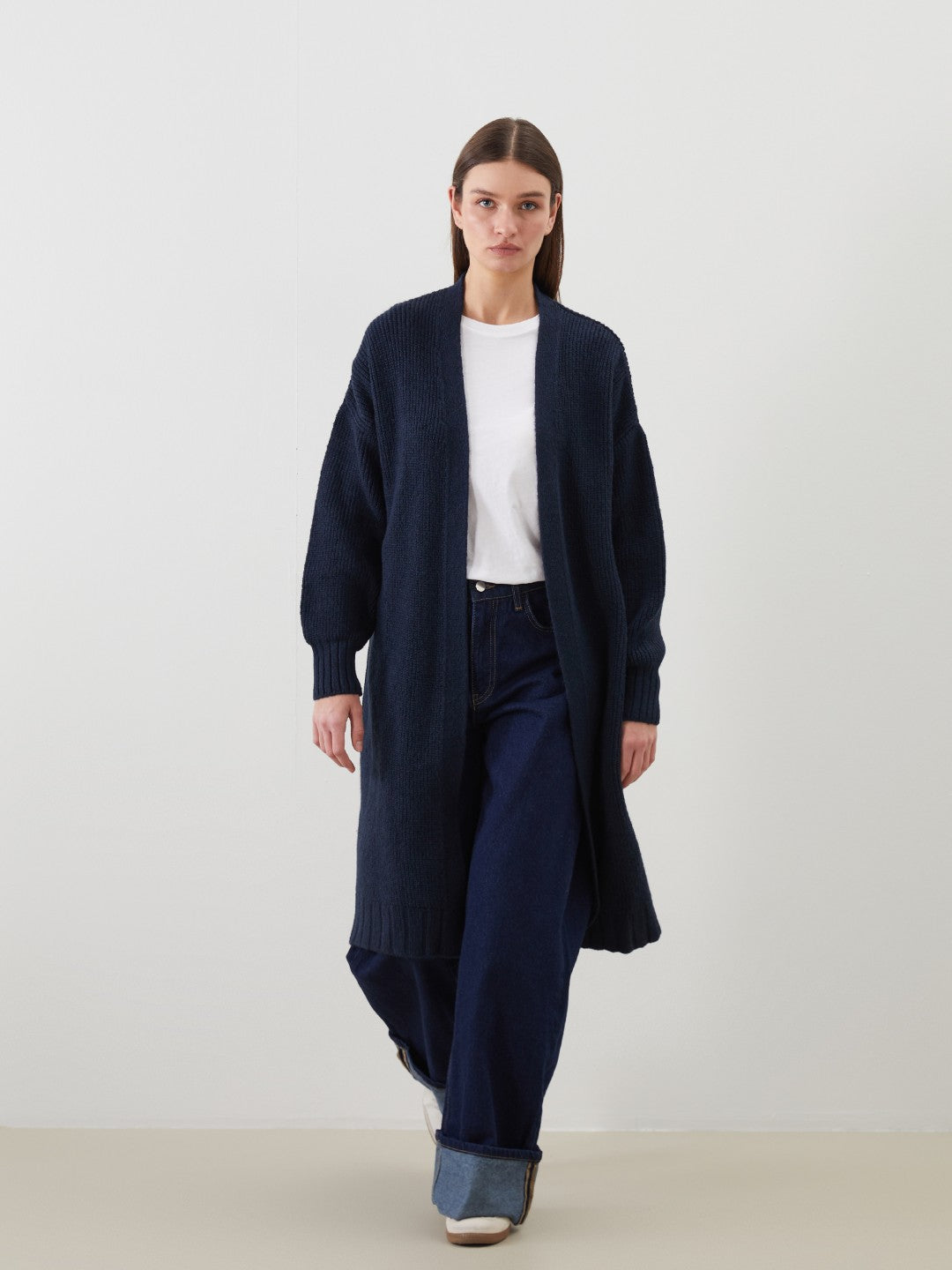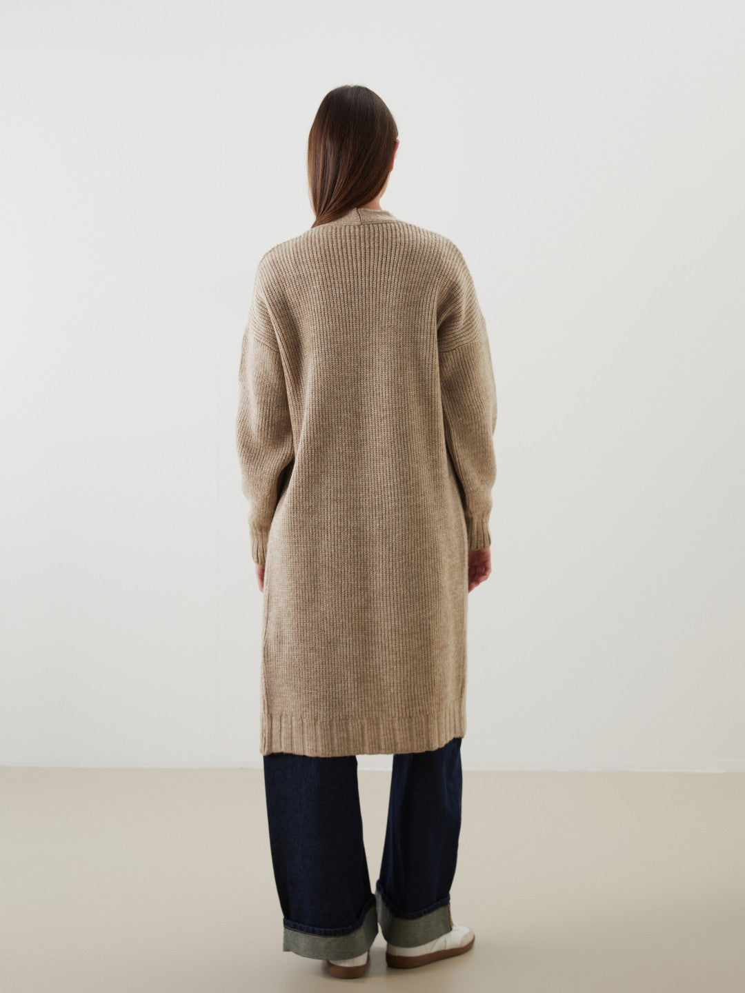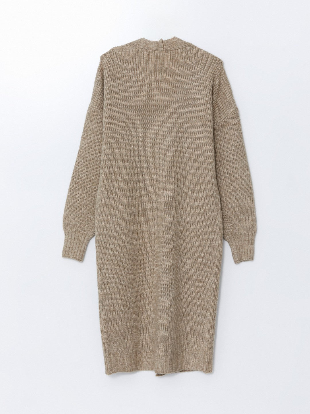 Shawl collar women cardigan made of knitwear. Designed with a midi length and wide fit.