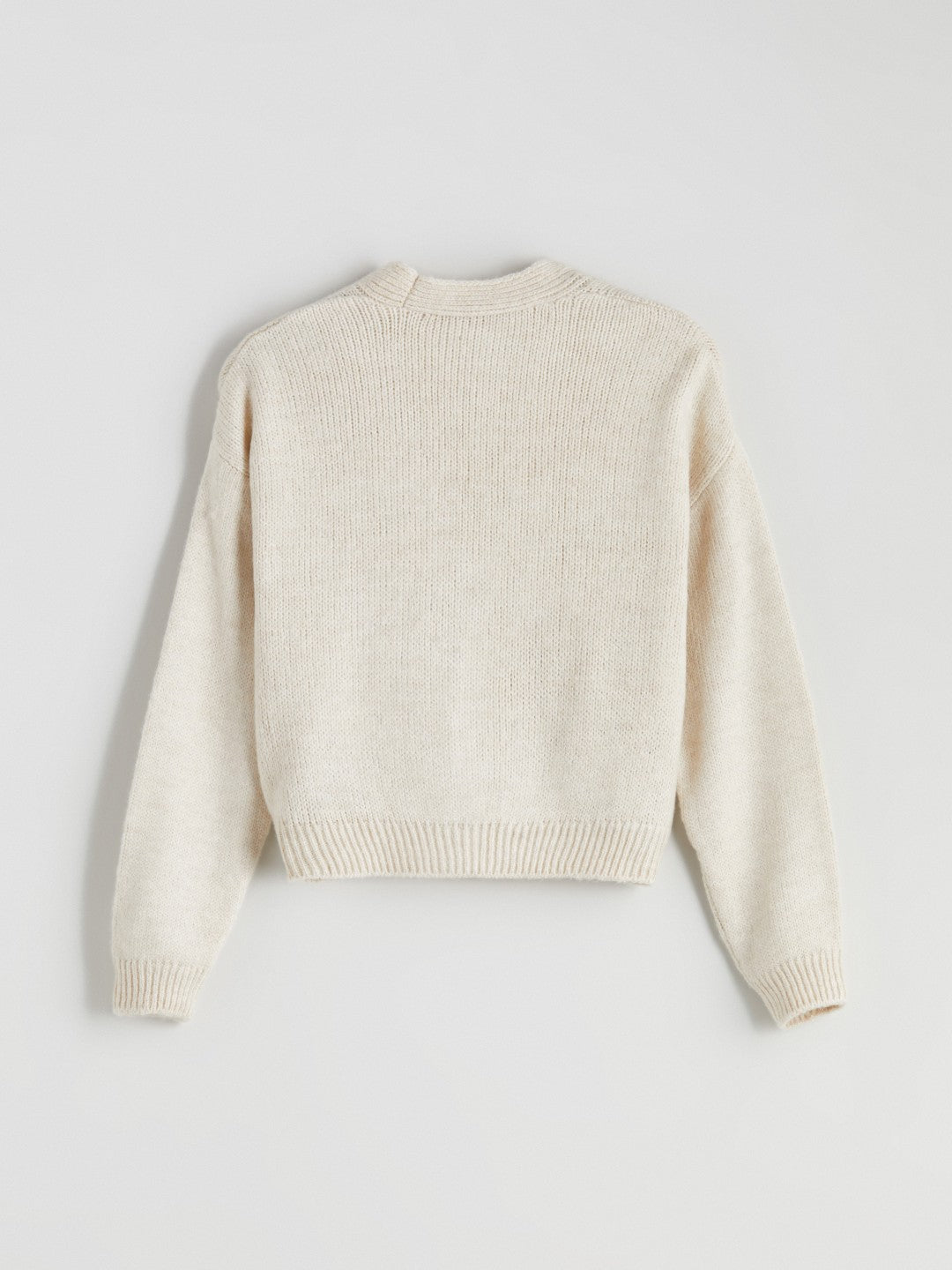 V-neck women knit cardigan has a button-down design and ribbed ankles and bottom.
