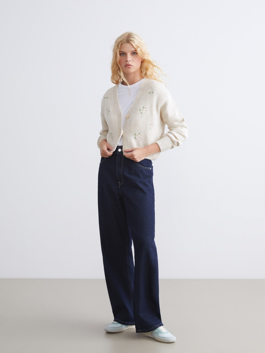 Xside Beige V-Neck Floral Embroidered Women Knitwear Cardigan