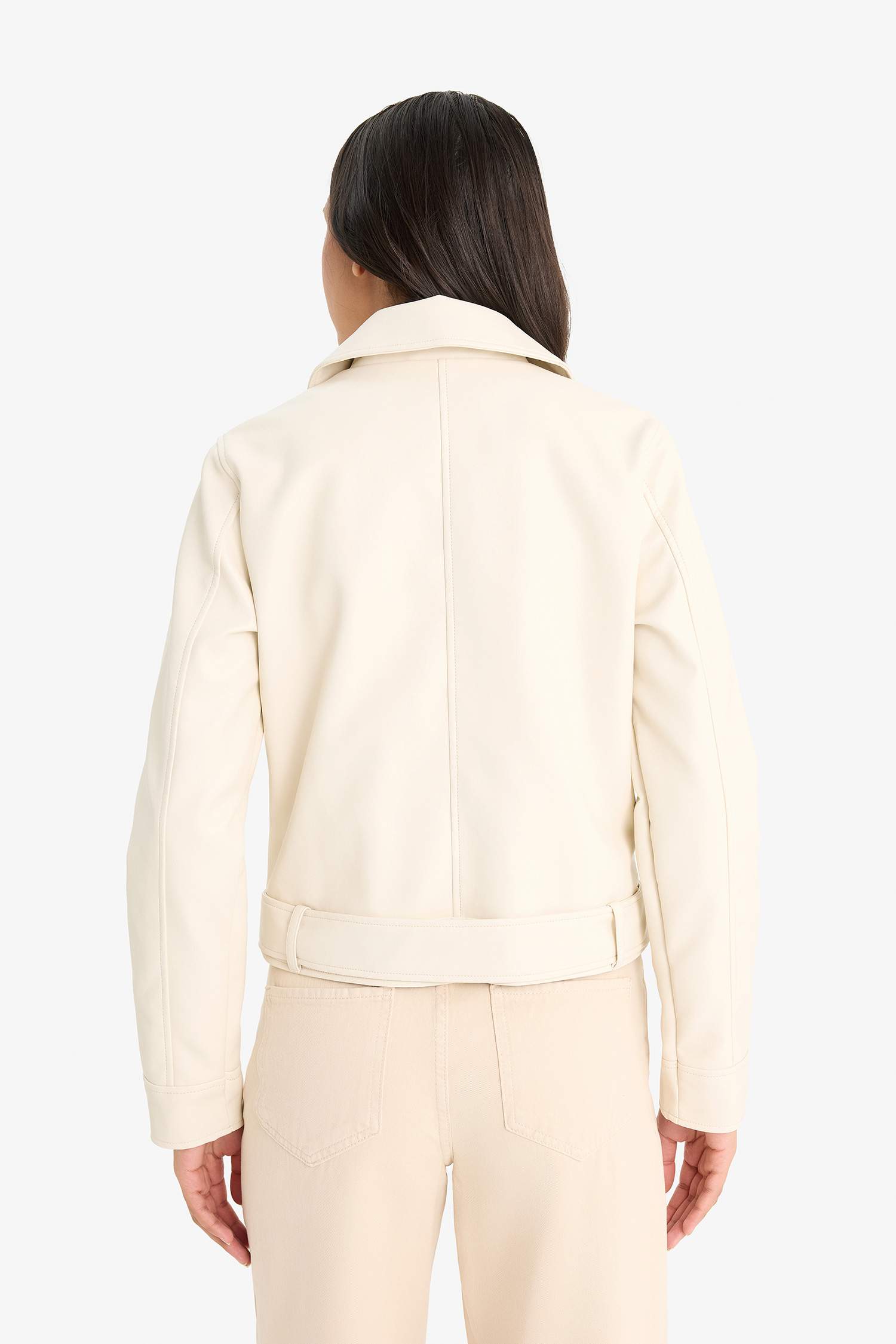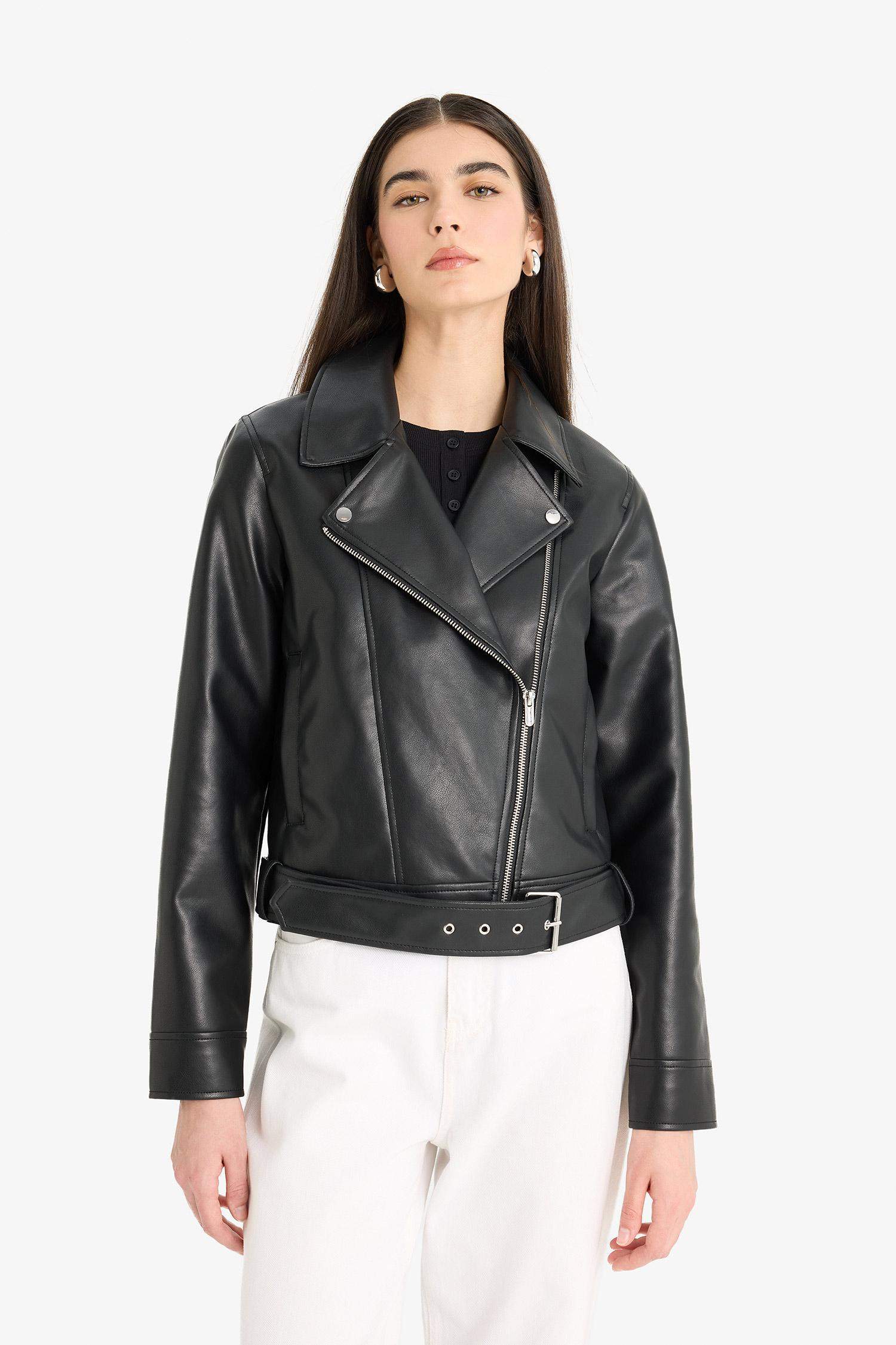 Regular Fit Zippered Faux Leather Jacket Coat