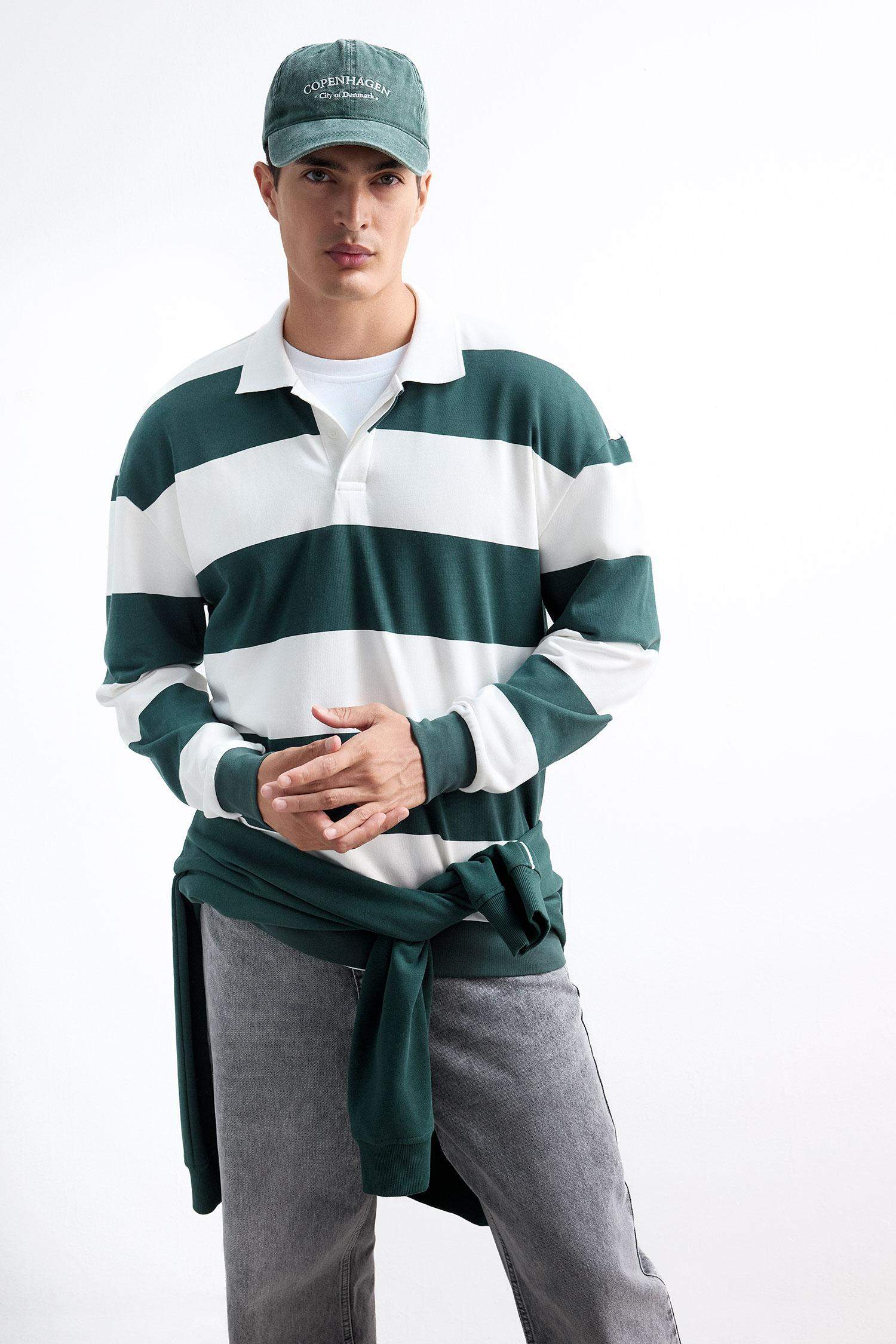 Boxy Fit Relaxed Cut Polo Collar Button-Down Striped Sweatshirt