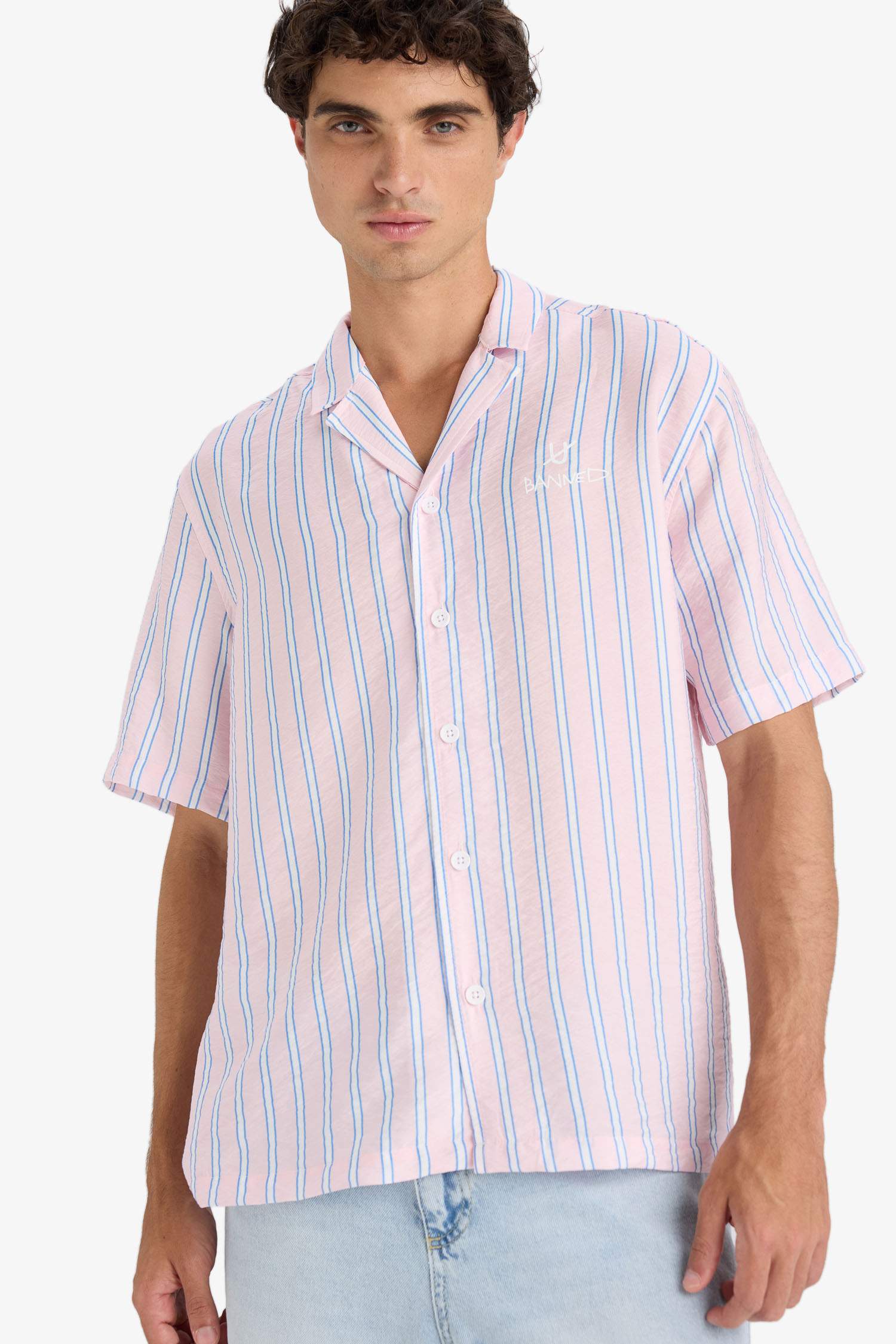 Relax Fit Open Collar Printed Woven Striped Short Sleeve Shirt