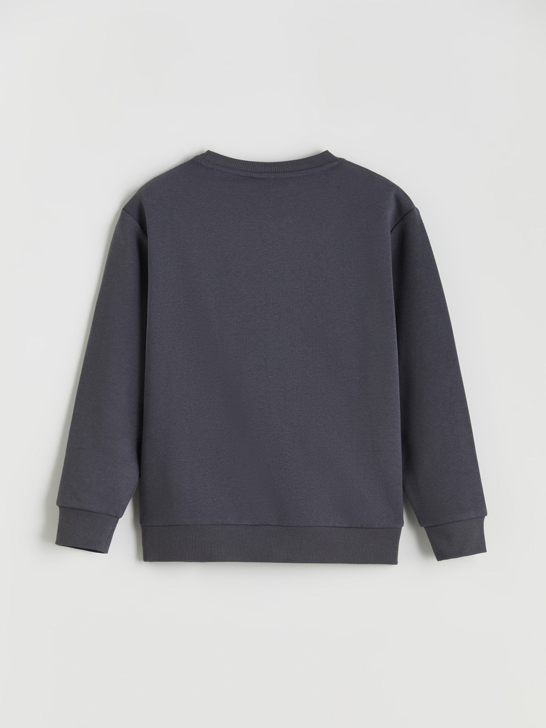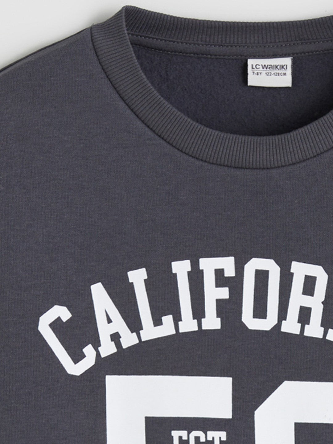 This long-sleeved, crew-neck sweatshirt for boys is made of thick, triple-threaded, raised fabric. It features a text and number print on the front.