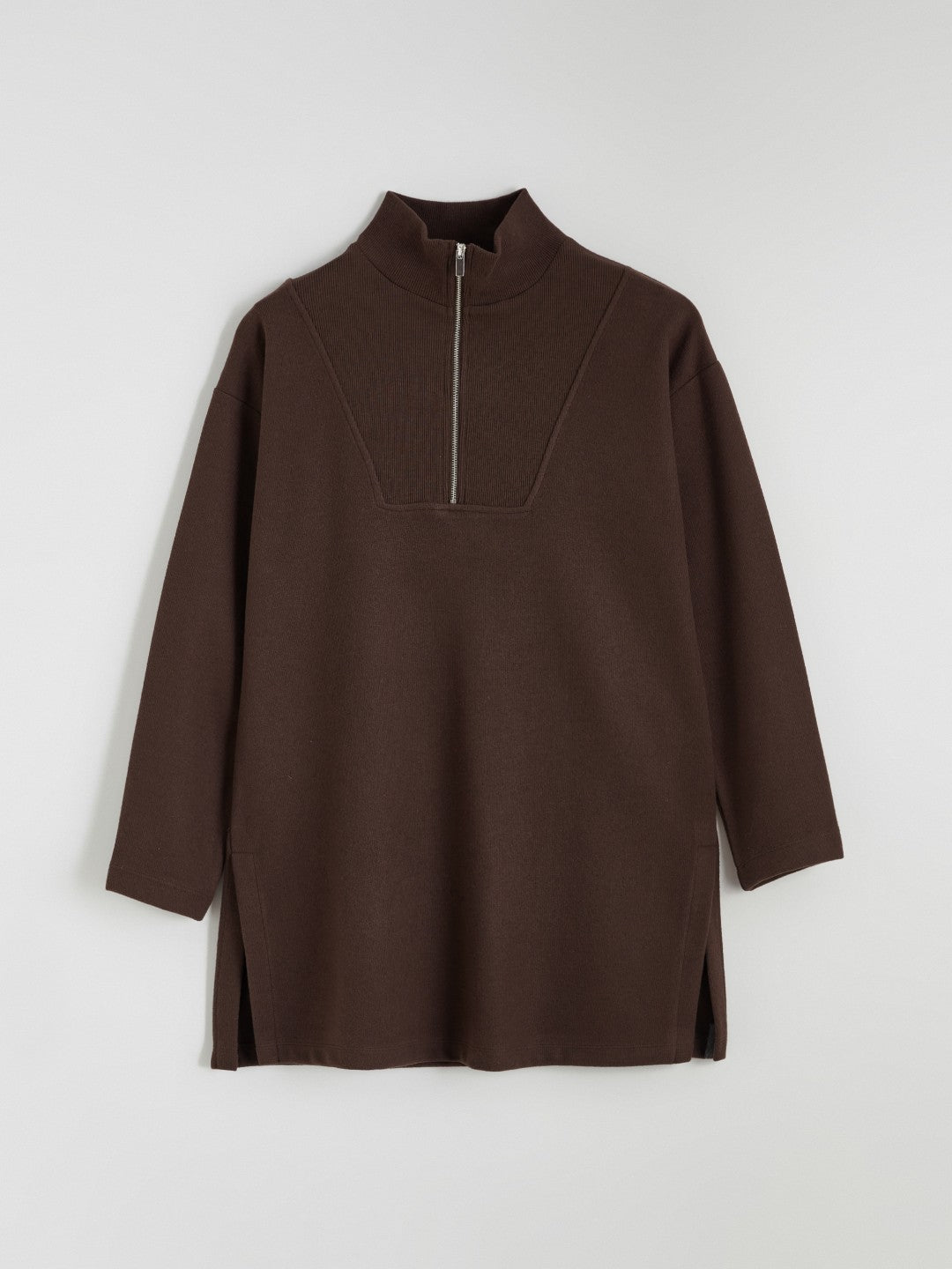 Hip length Women sweatshirt tunic has a funnel neck and half-zip closure. It has long sleeves and side slits at the hem.