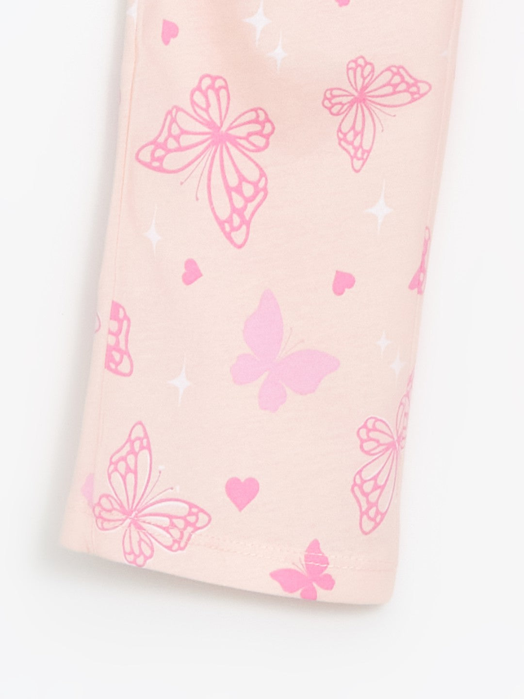The set, consisting of a comfortable pajama top and standard-fit pajama bottoms, is designed with a butterfly print from 100% combed cotton fabric.