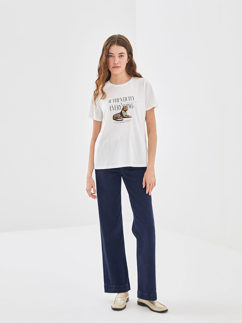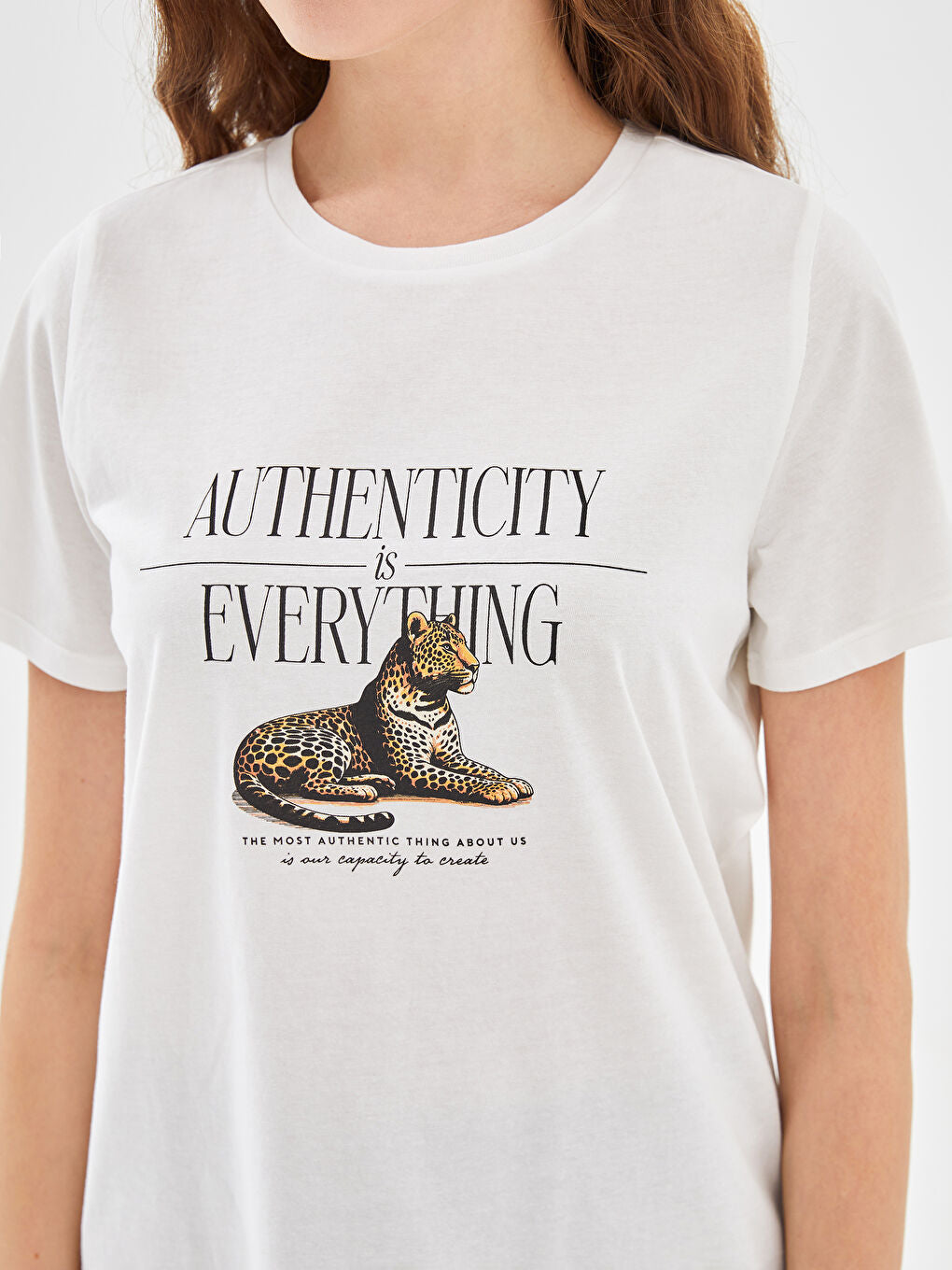 LCW Vision Ecru Crew Neck Leopard Printed Women T-Shirt
