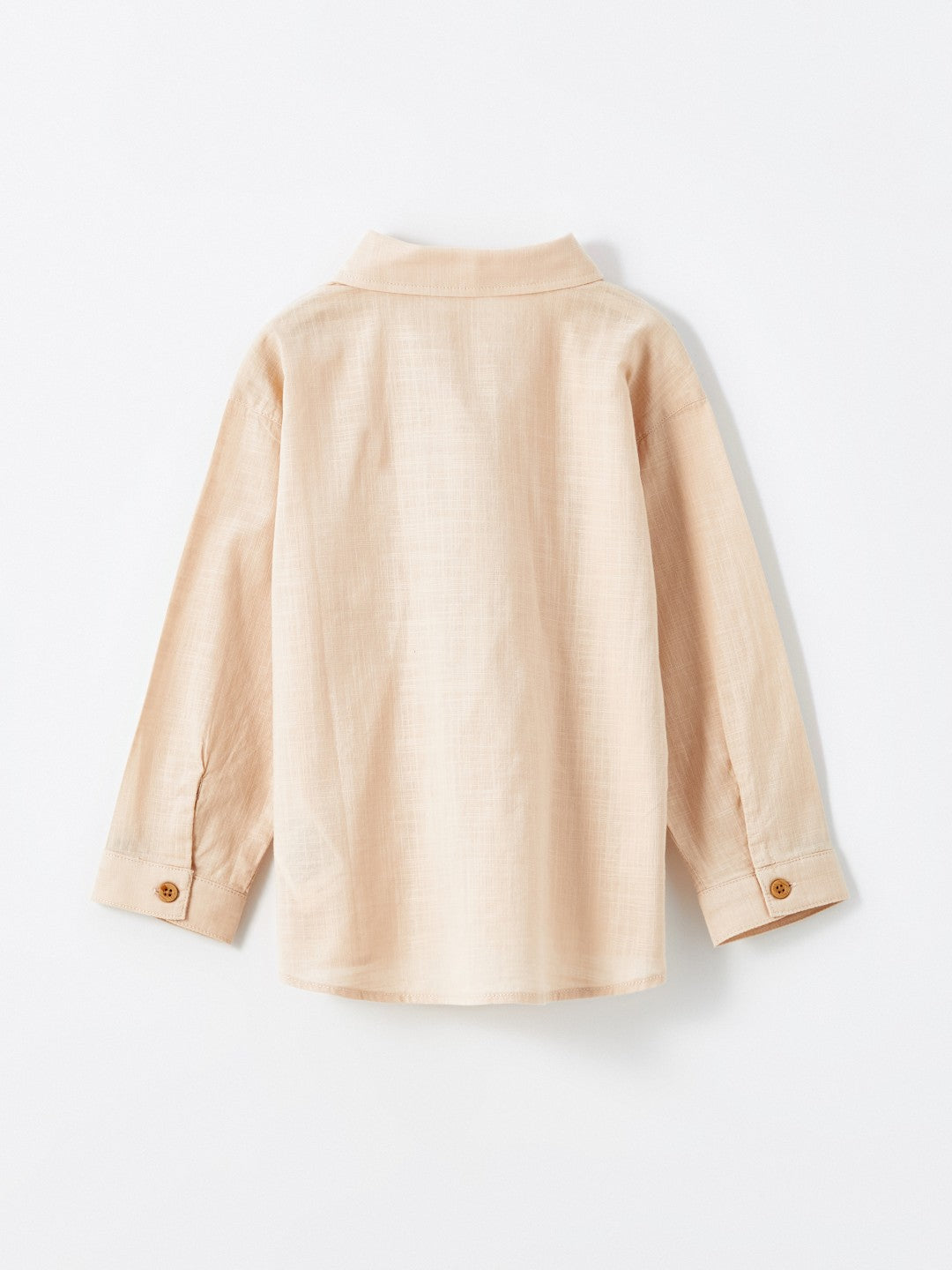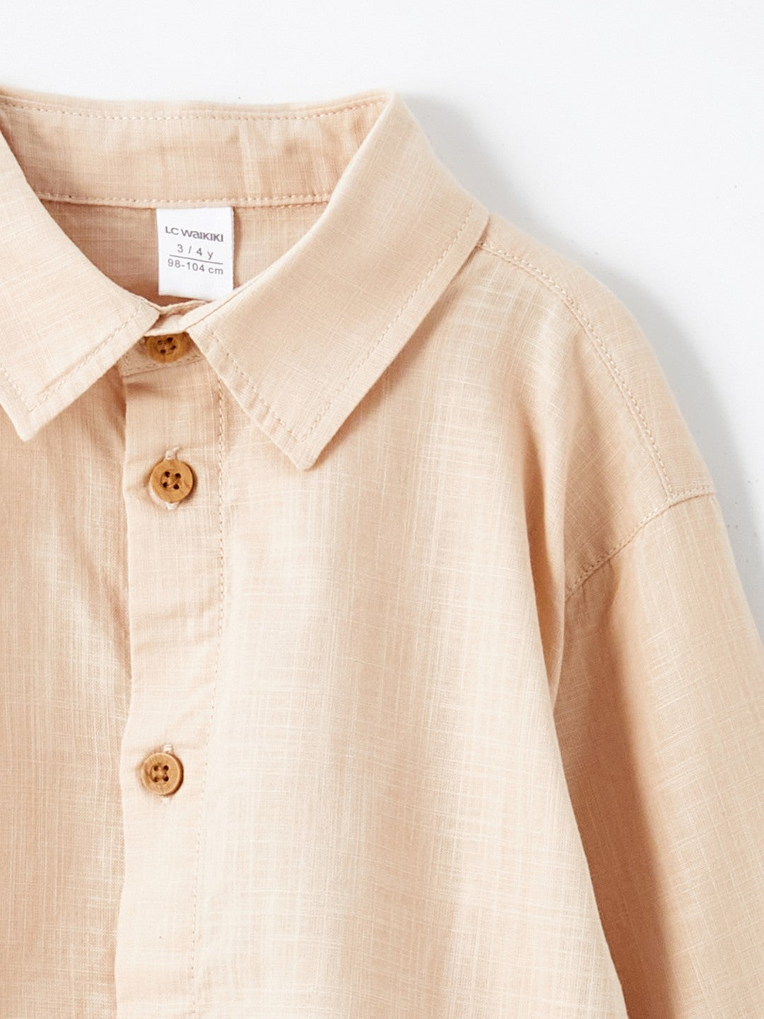 Made of 100% cotton poplin fabric, the boy's suit consists of a shirt collar, long-sleeved shirt, and long trousers with elasticated waist and pockets.