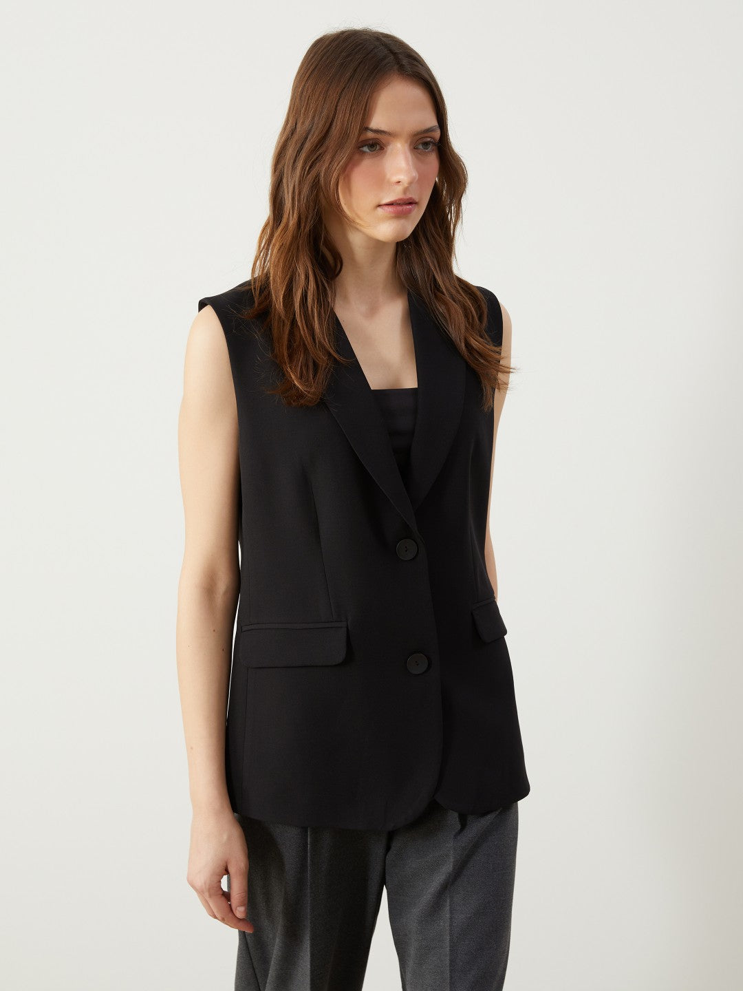 This women's vest with a jacket collar is made of gabardine fabric. The sleeveless model features a button-down front and flap pockets.