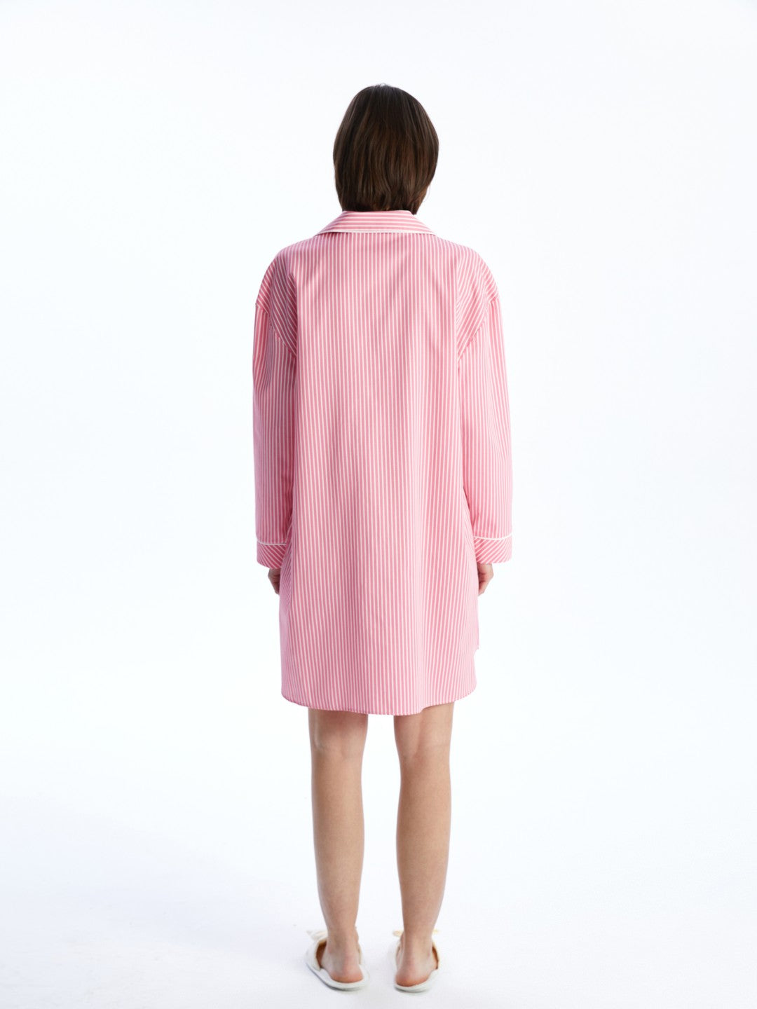 A women nightgown made of voile fabric, featuring a shirt collar, long sleeves, a button-down front, a striped pattern, and a chest pocket.
