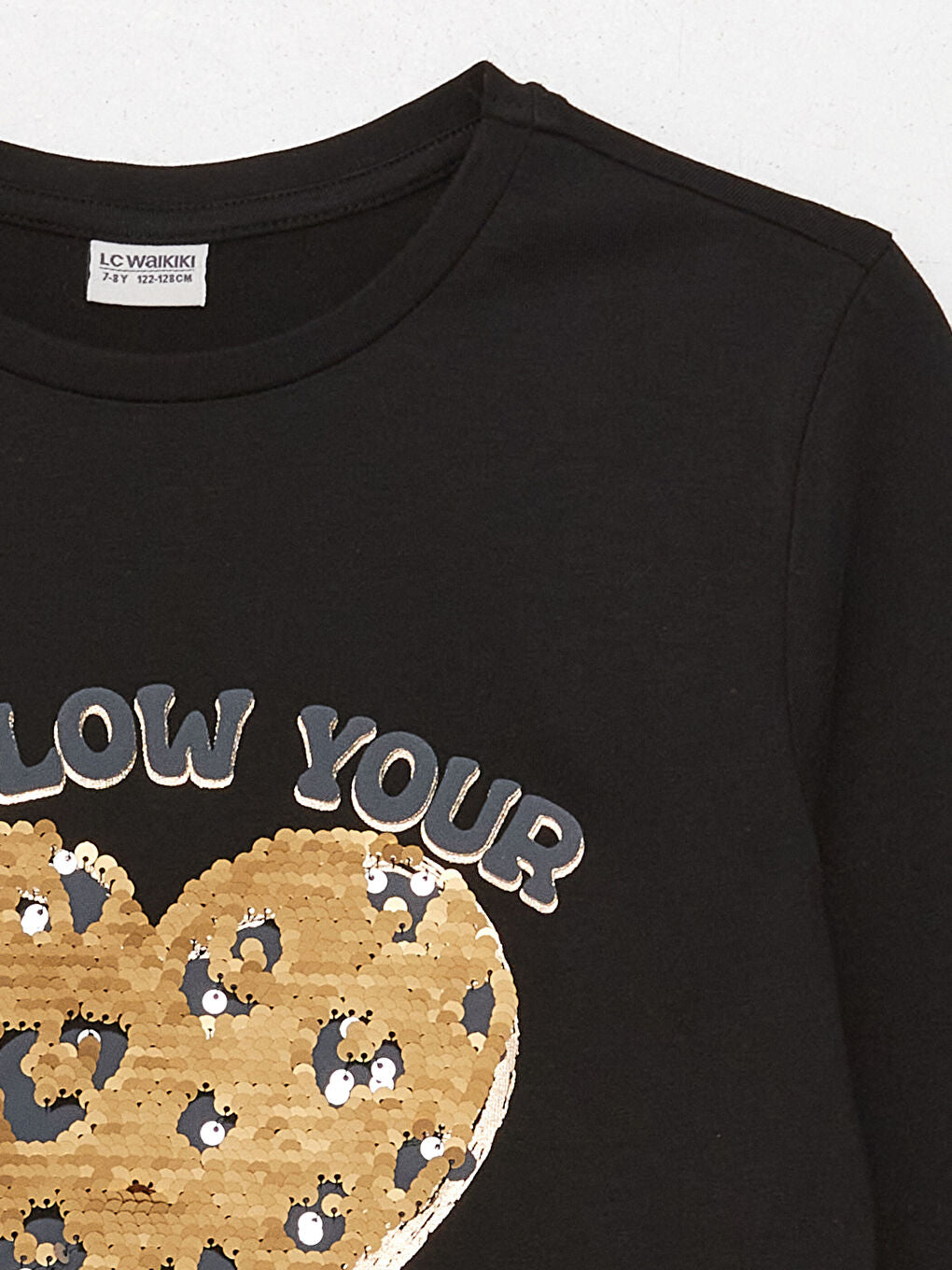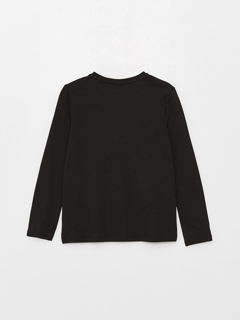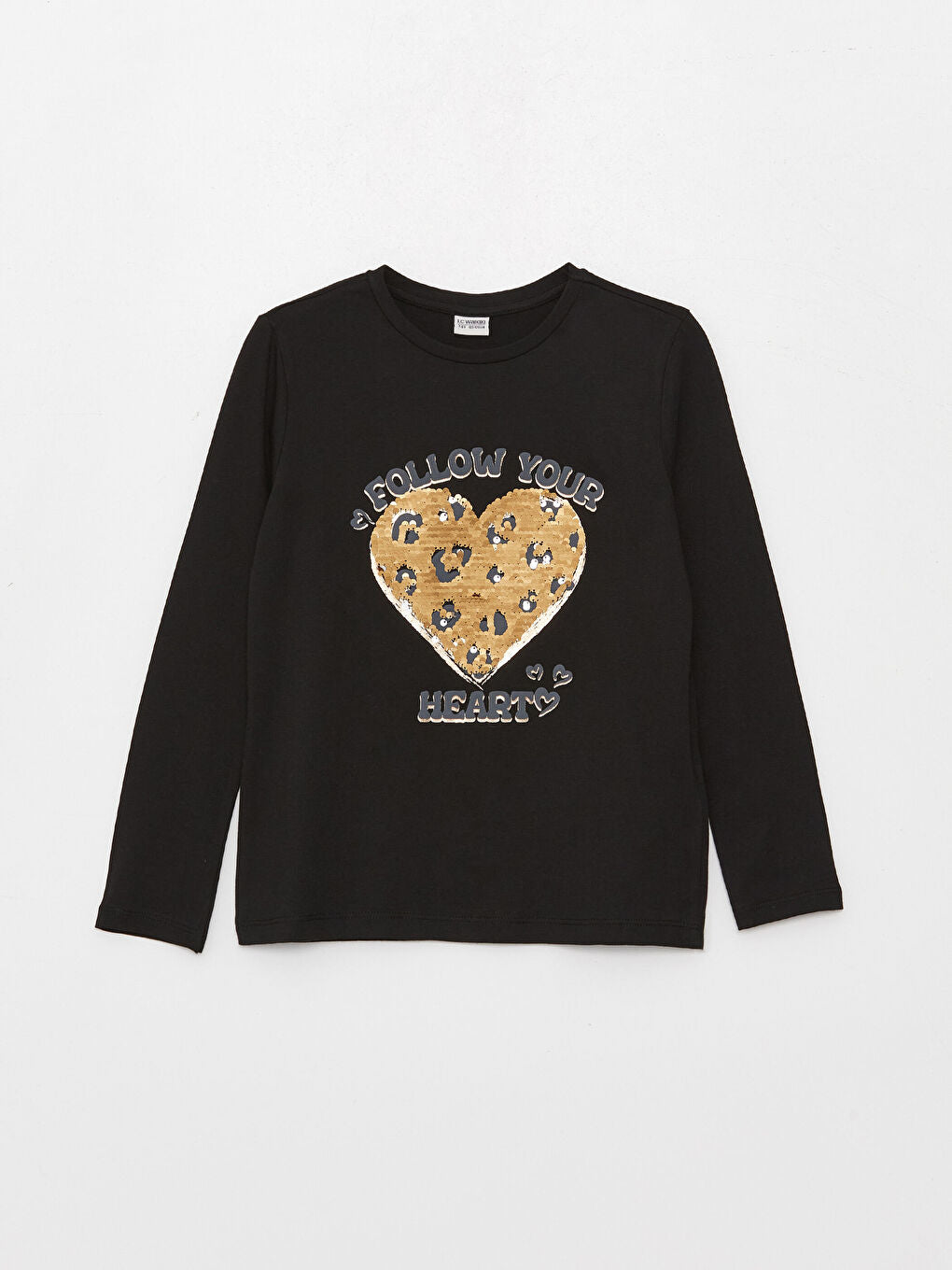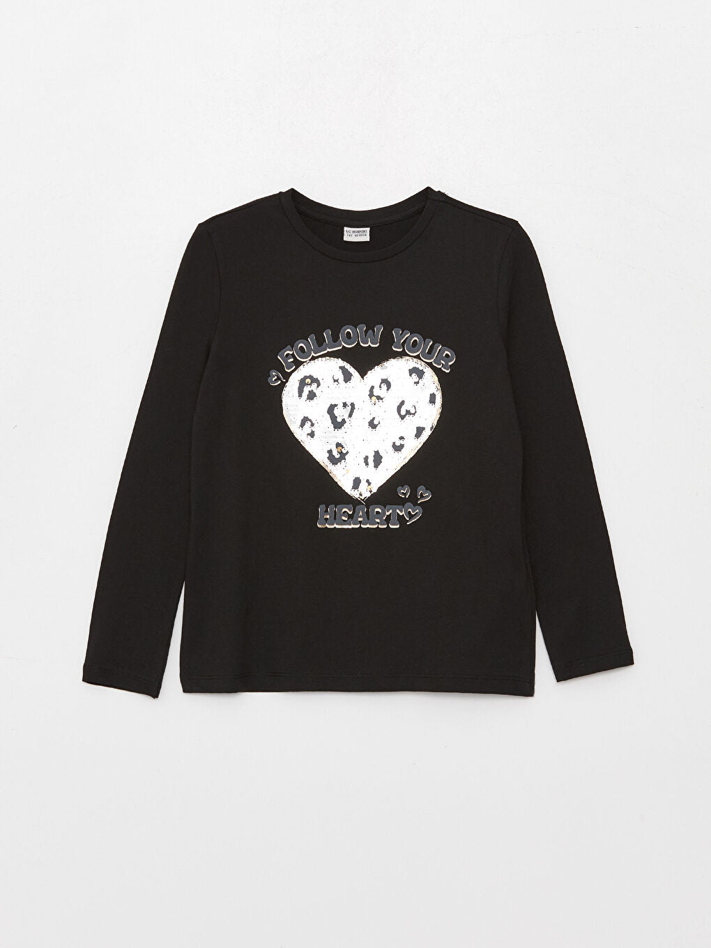 تي شيرت بناتي بأكمام طويلة ومطرز على الوجهين وياقة دائرية ومطبوع