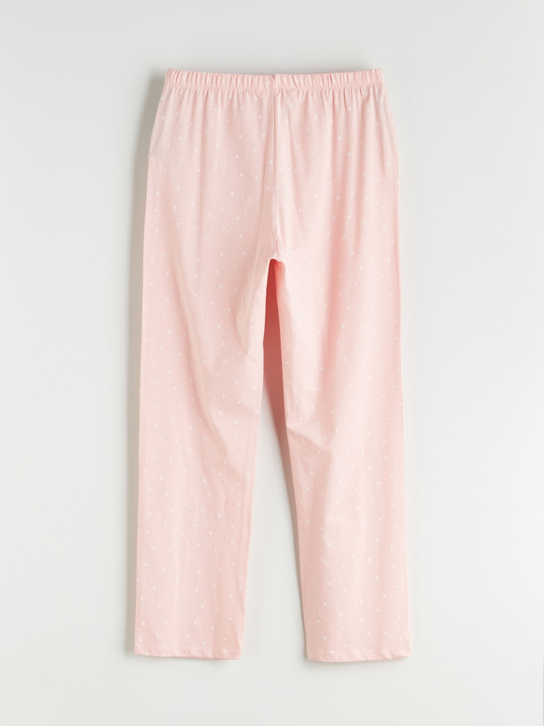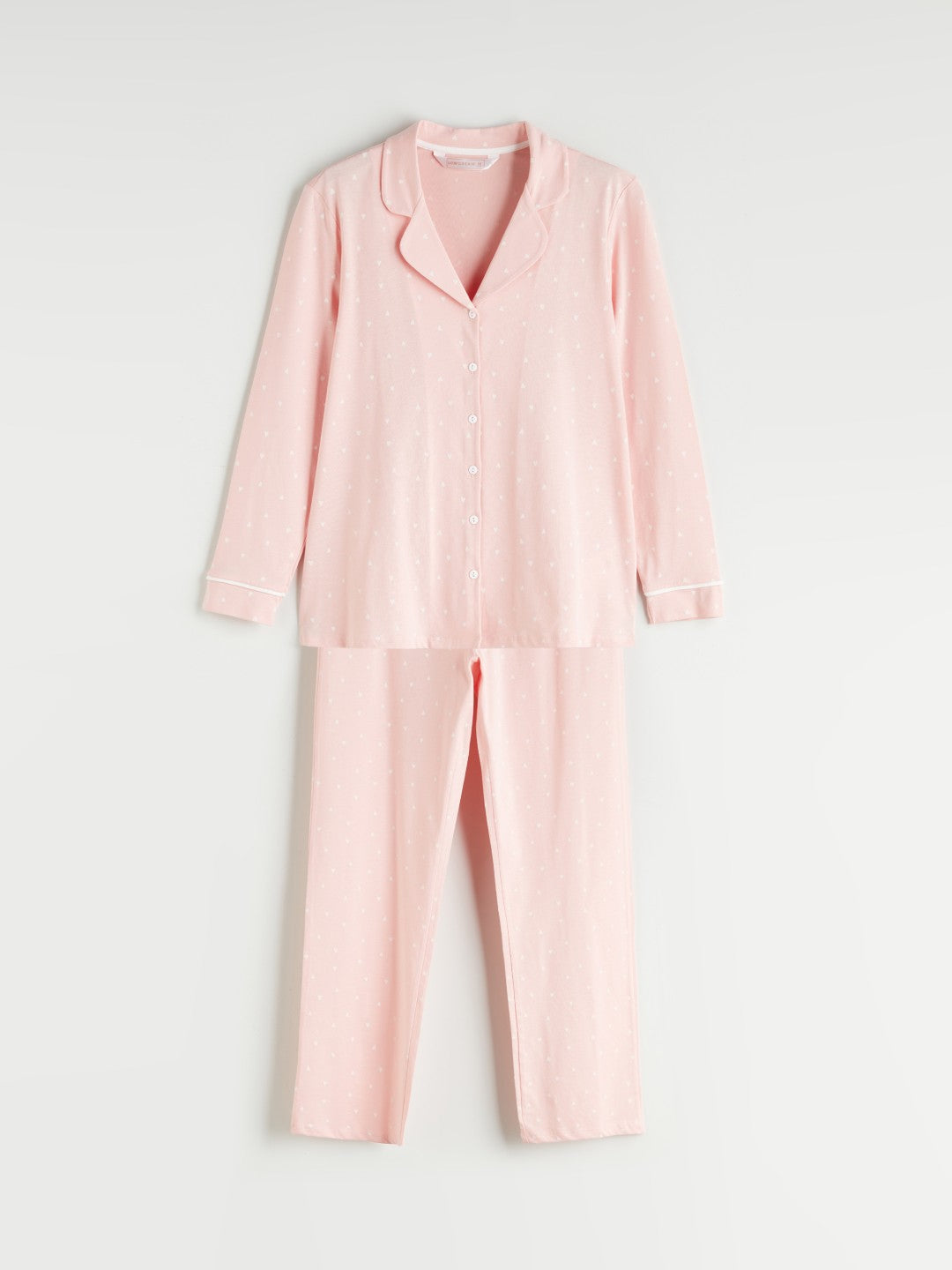 This women pajama set is made of cotton fabric and consists of a button-down pajama top and elasticated waist pajama bottoms.