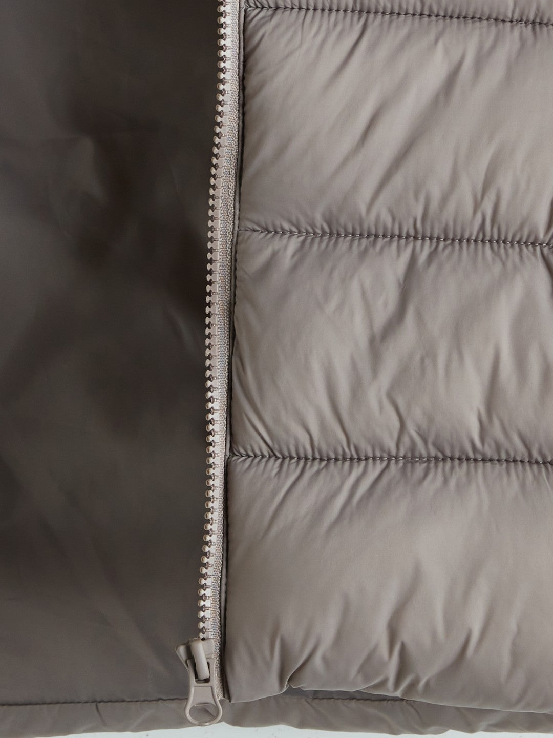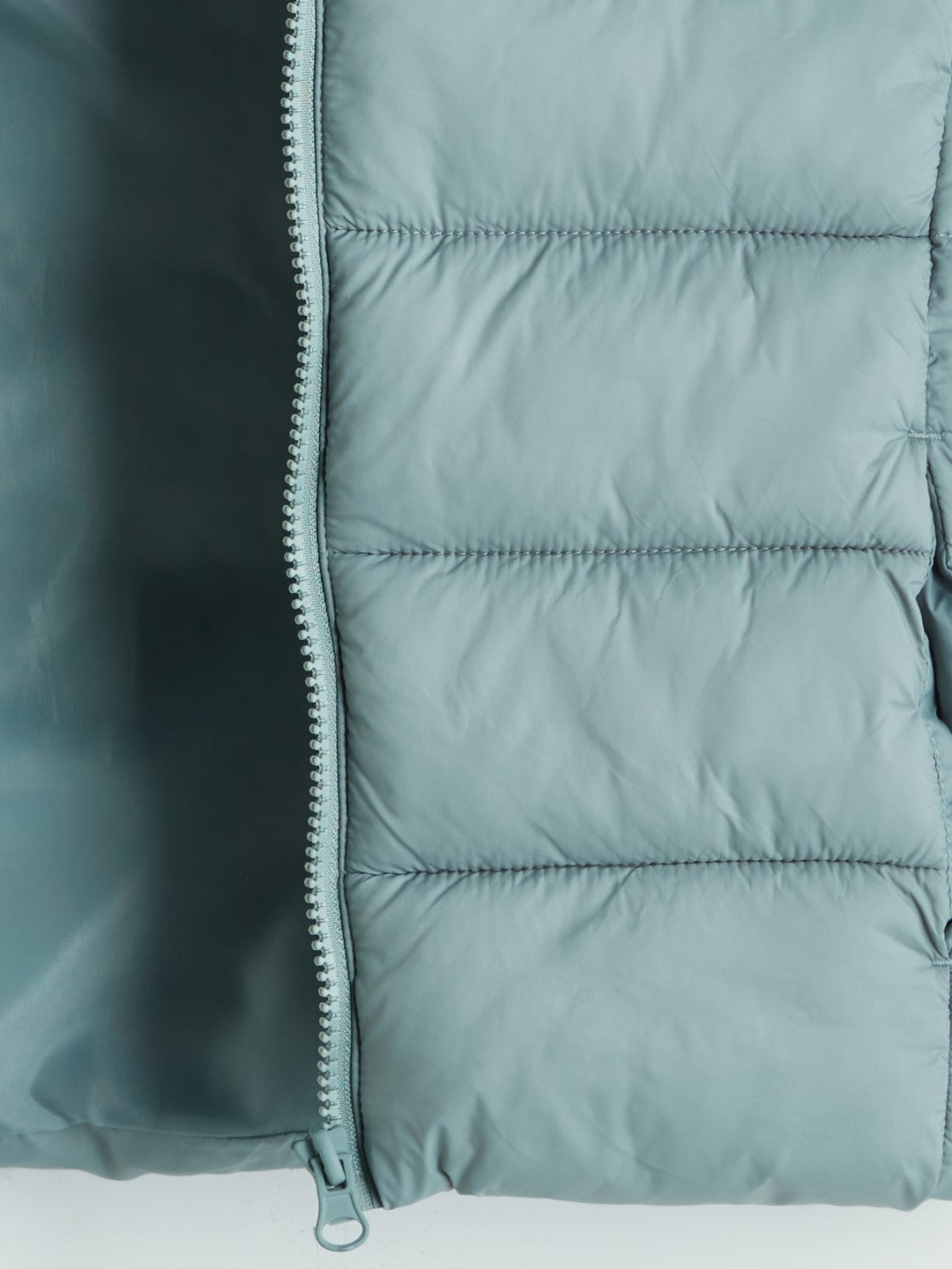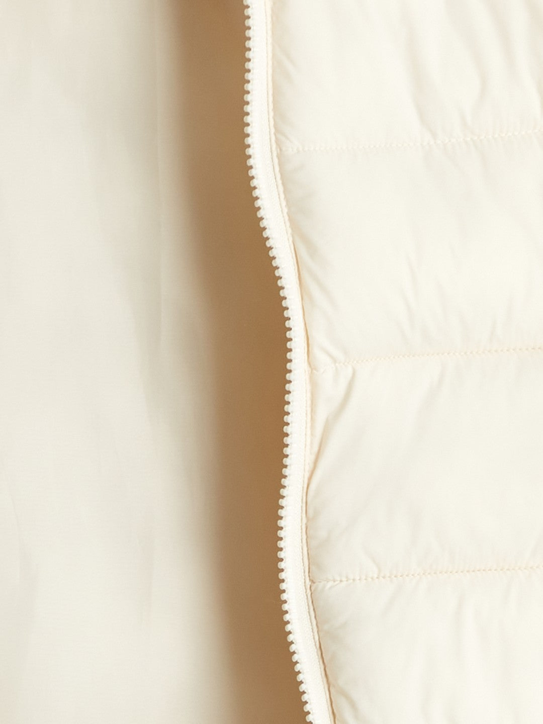 The girls vest, which has a hood and a full-length front zipper, has a horizontally stitched puffer design.