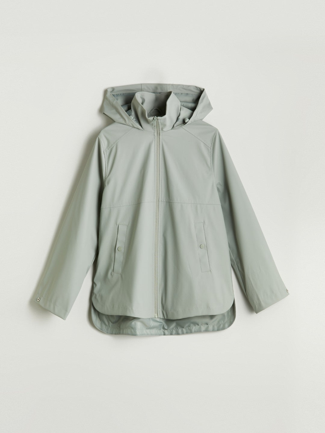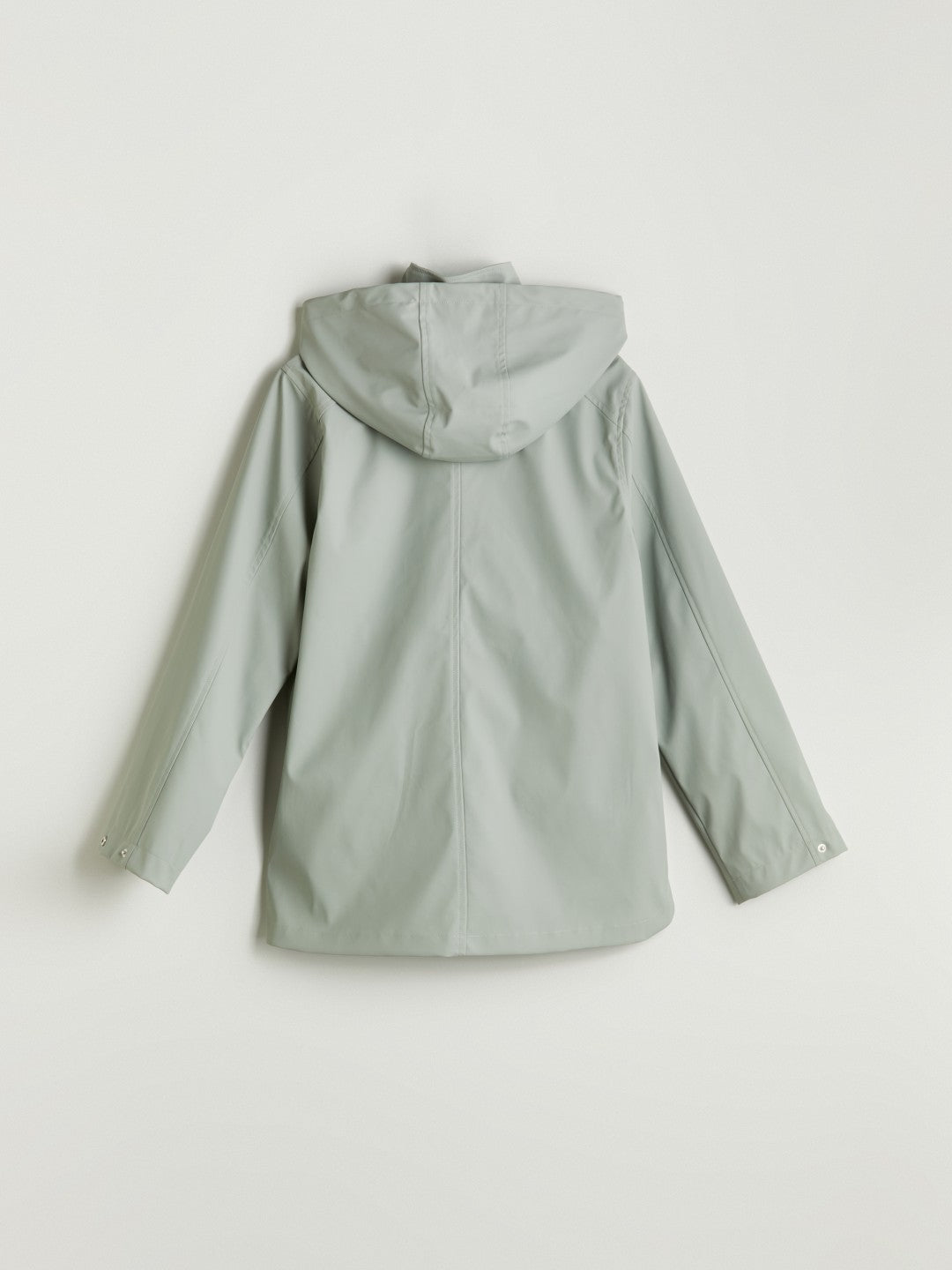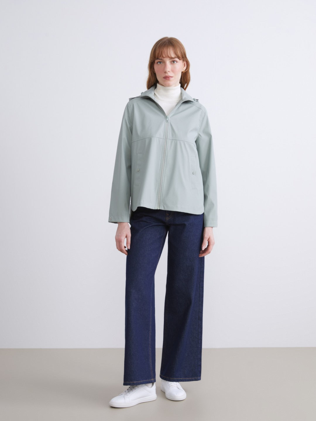This long-sleeved, hooded women raincoat is made of leather-look fabric. It features a front zipper, two side pockets, and a longer, adjustable, fixed hood.