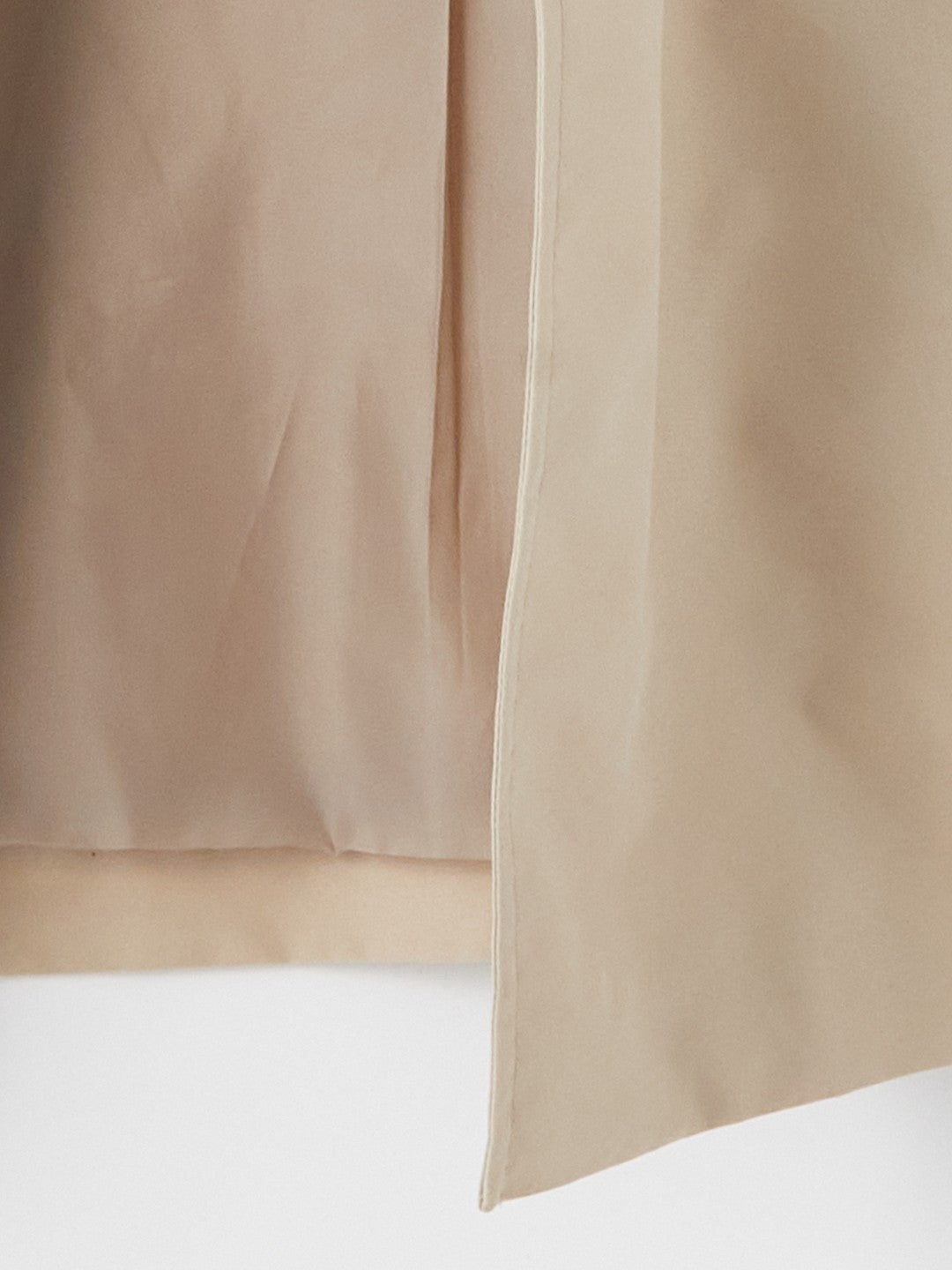 This women trench coat has a double-breasted collar, button closure, long sleeves, a self-fabric belt at the waist, and pockets.