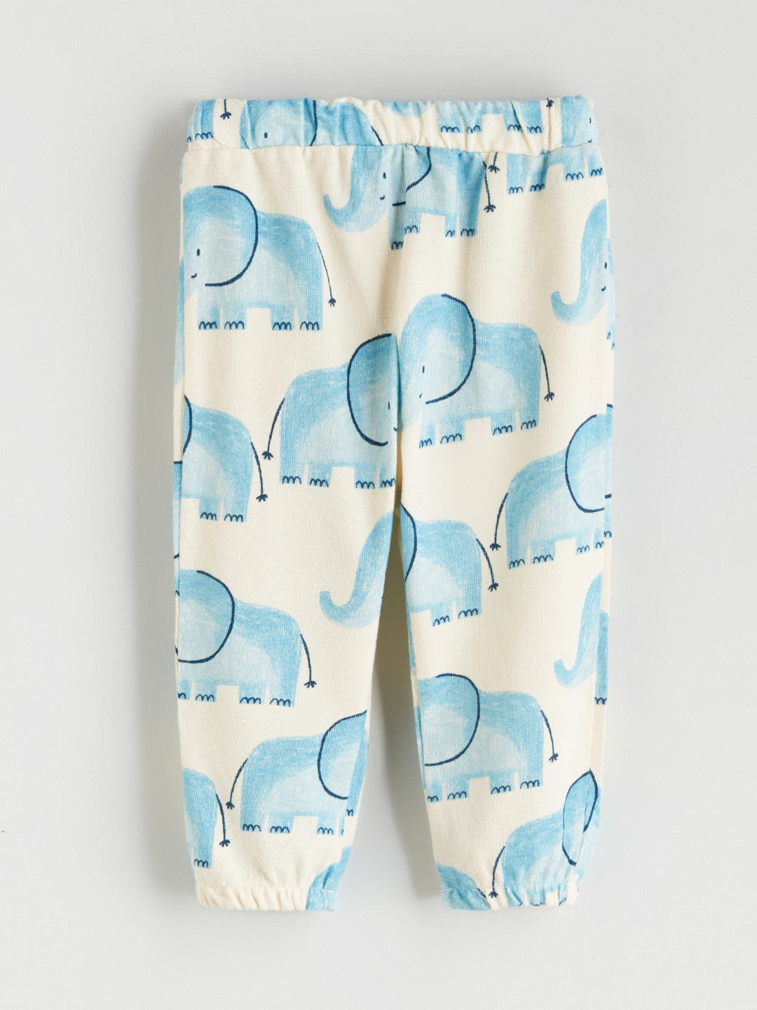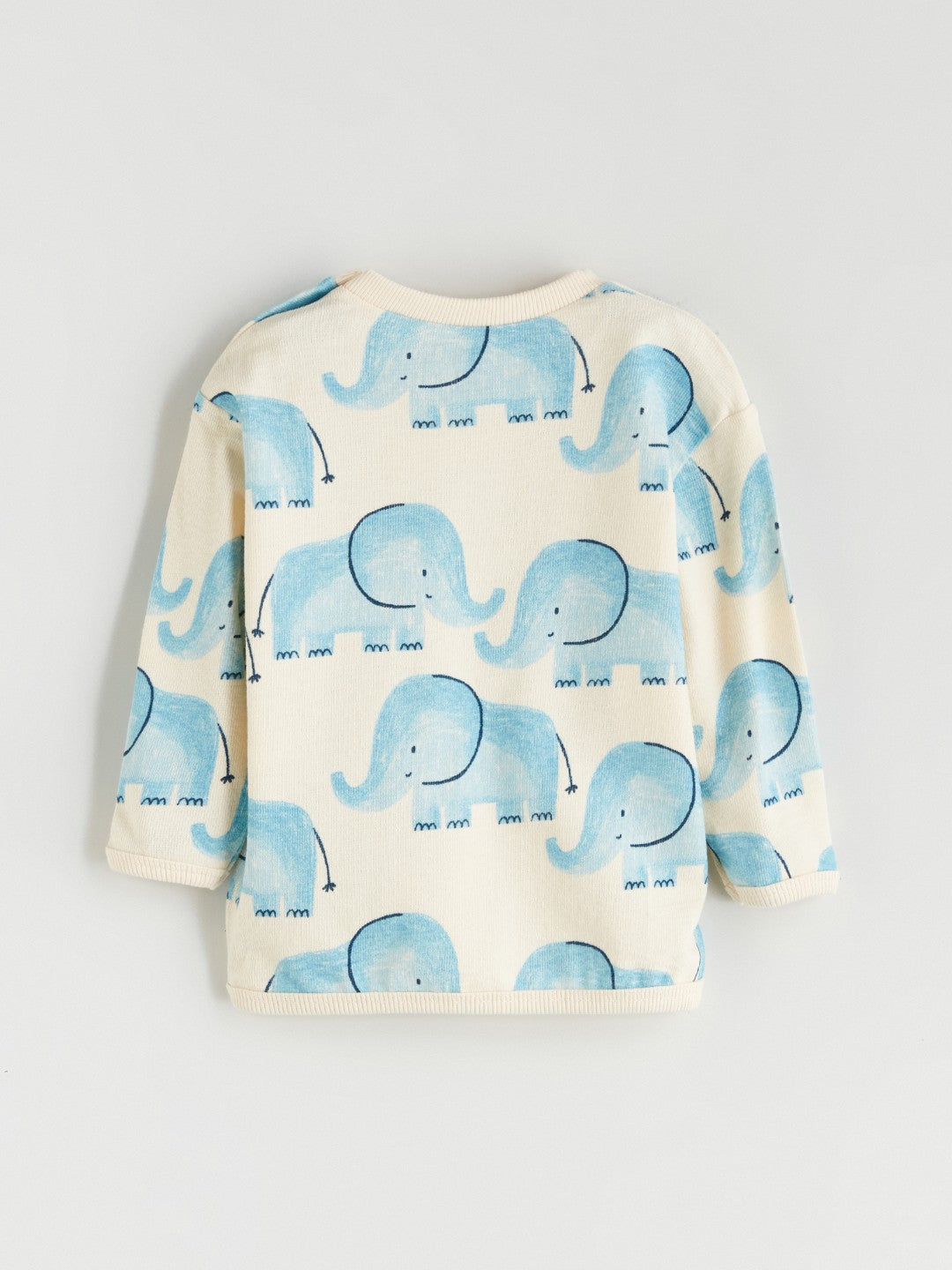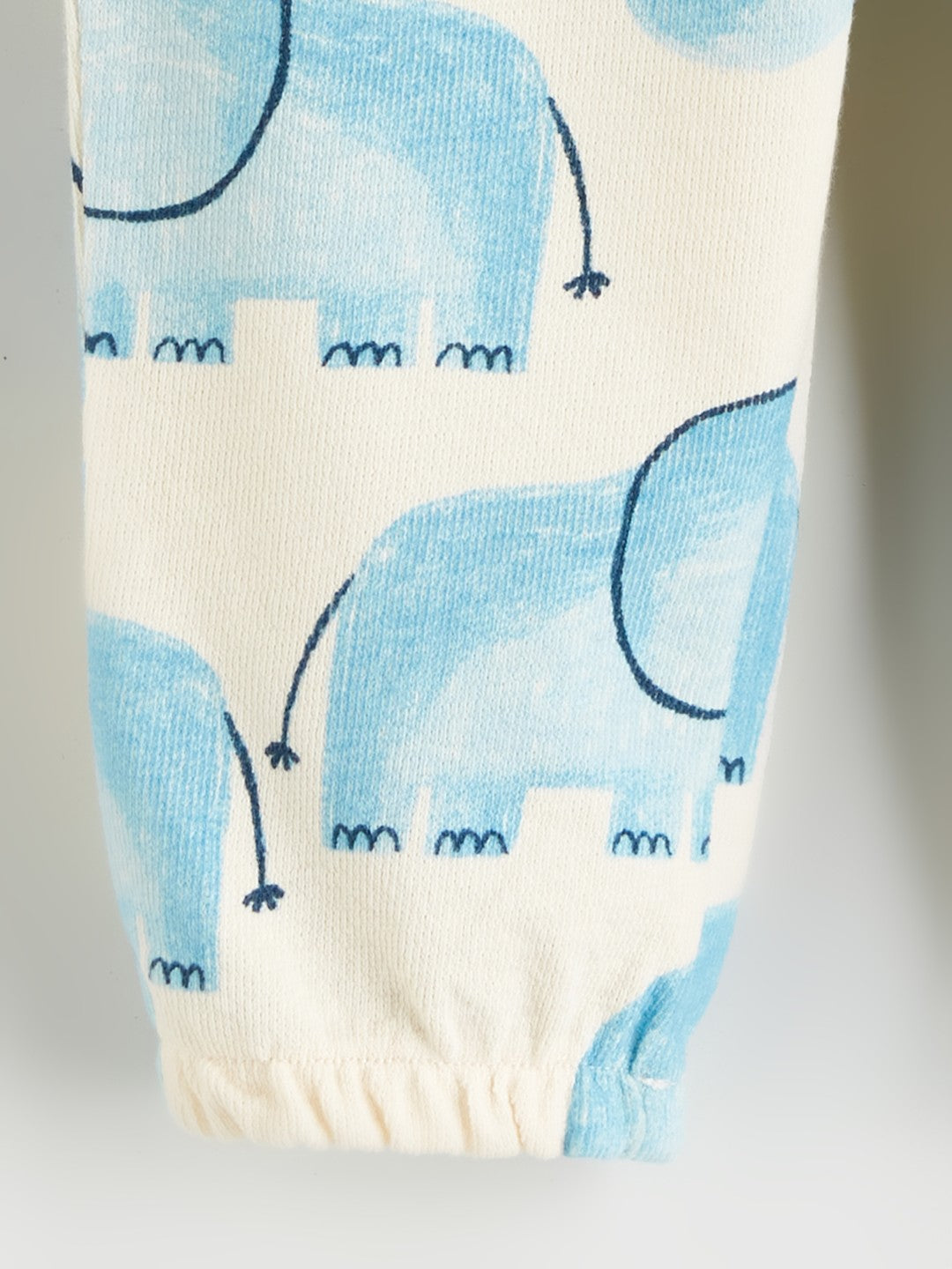 Made of cotton fabric. This is a 2-piece set consisting of a long-sleeved sweatshirt with an elephant print and joggers.