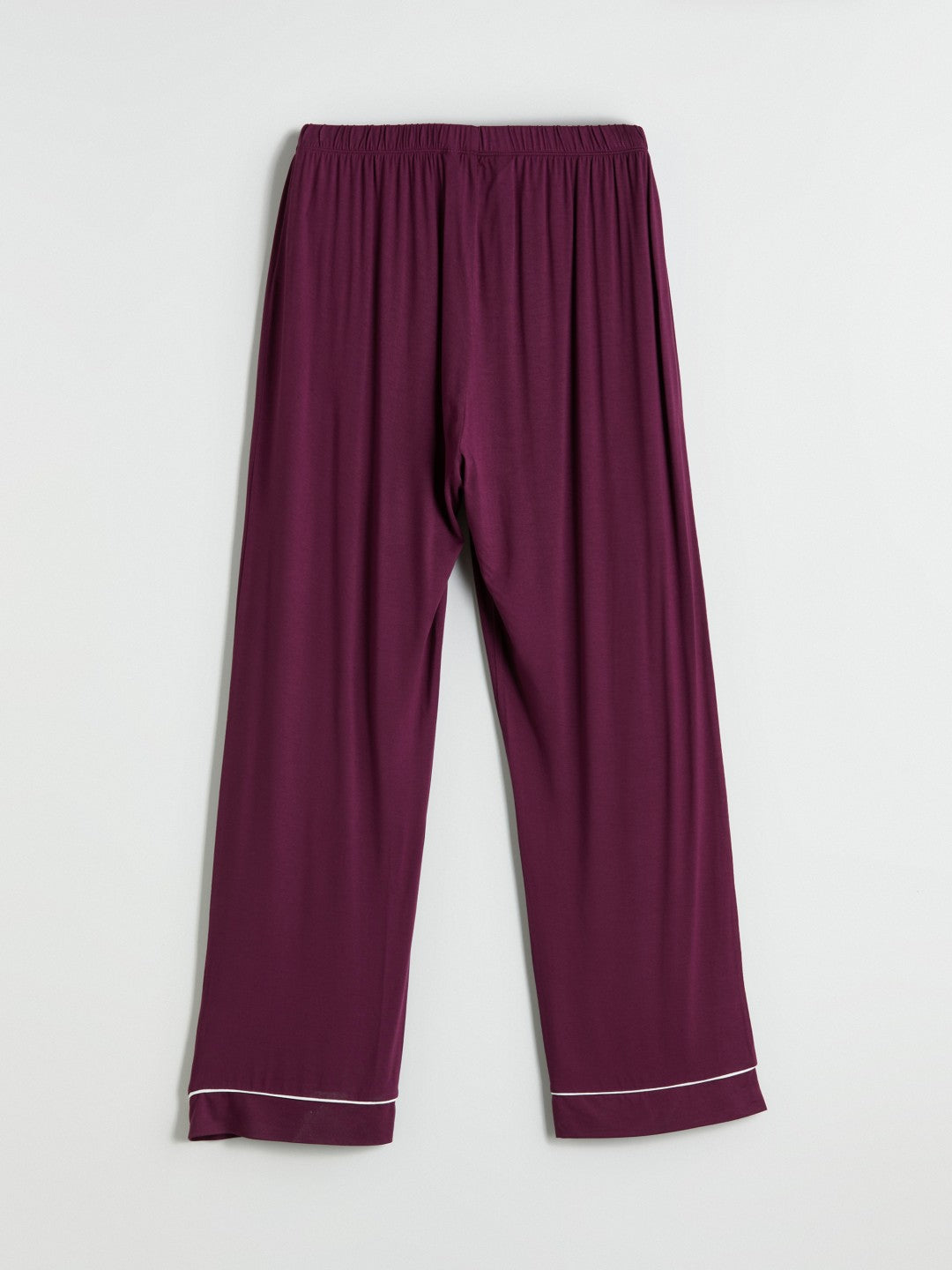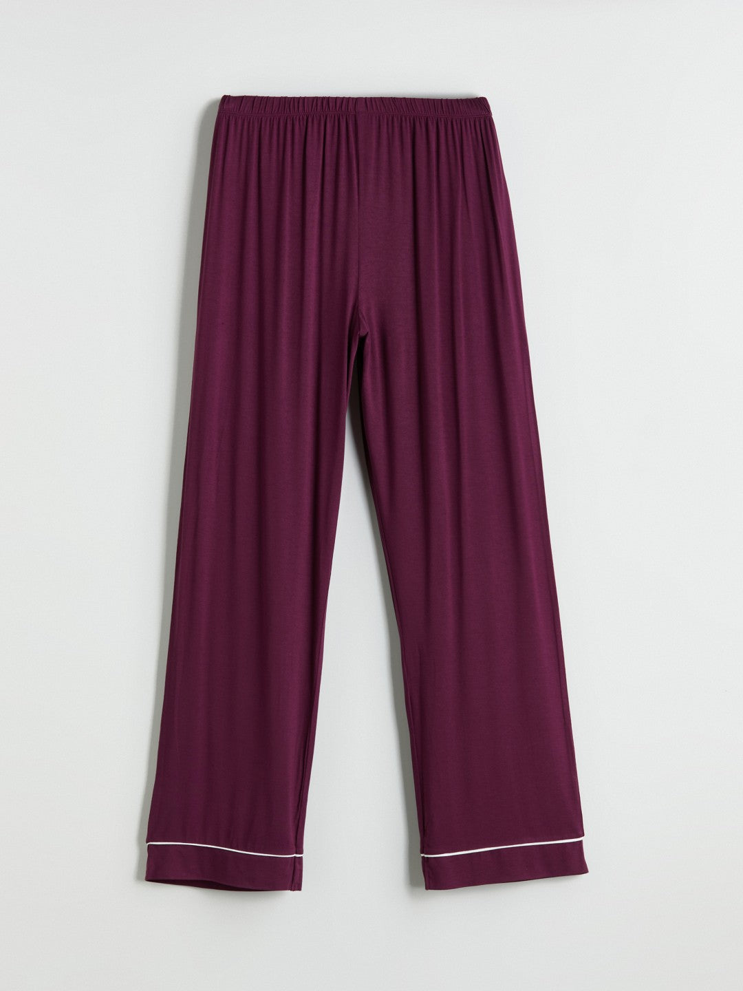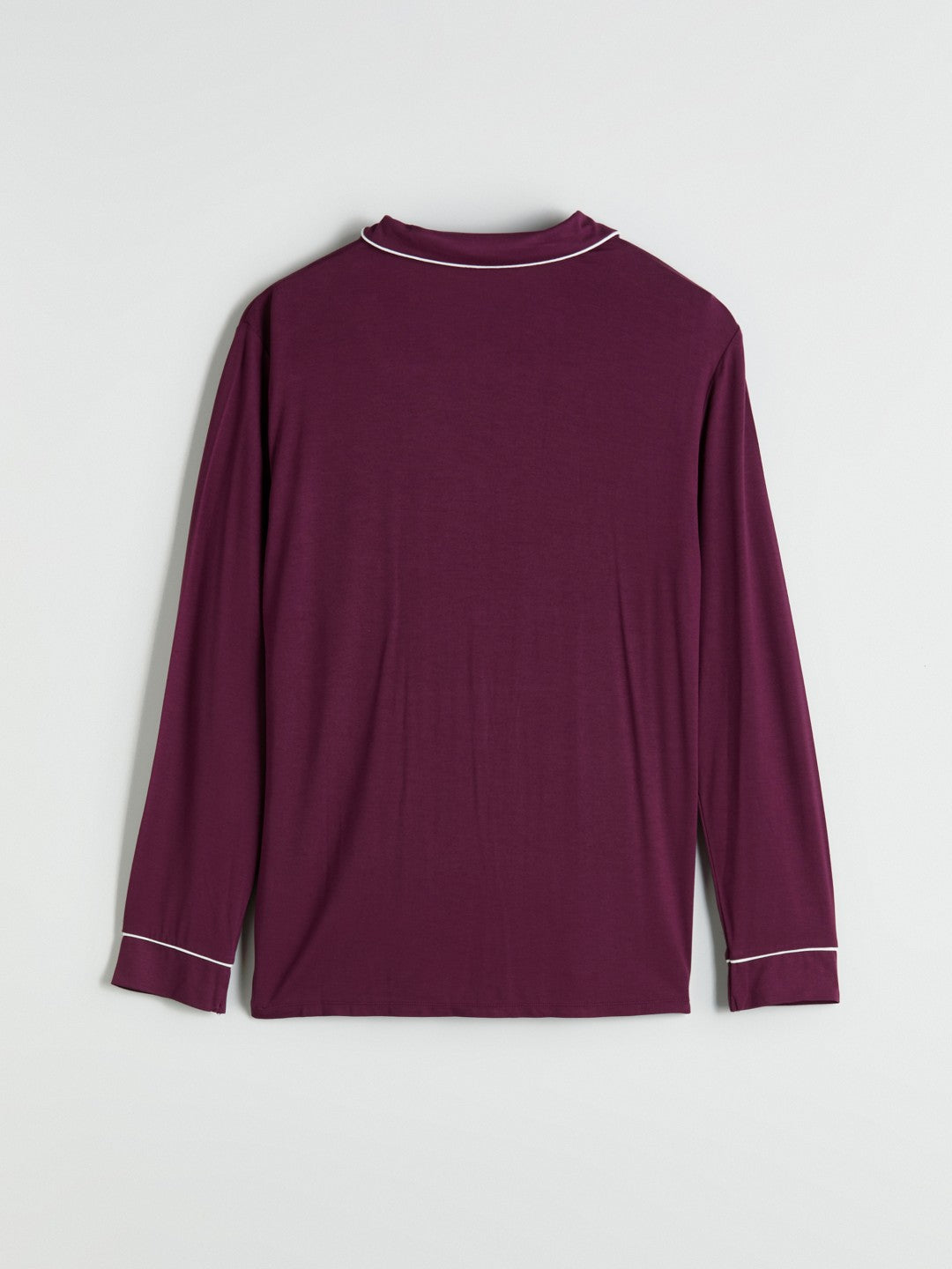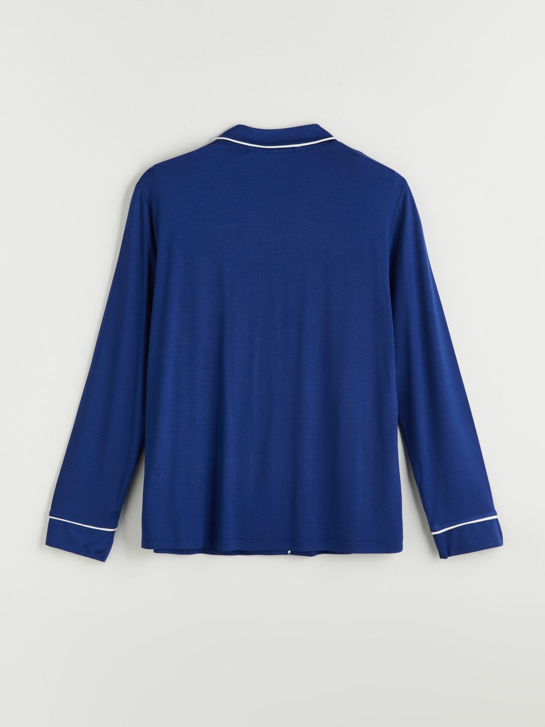 This shirt-collar women pajama set is made of stretchy viscose fabric. It consists of a long-sleeved pajama top and elasticated waist pajama bottoms.