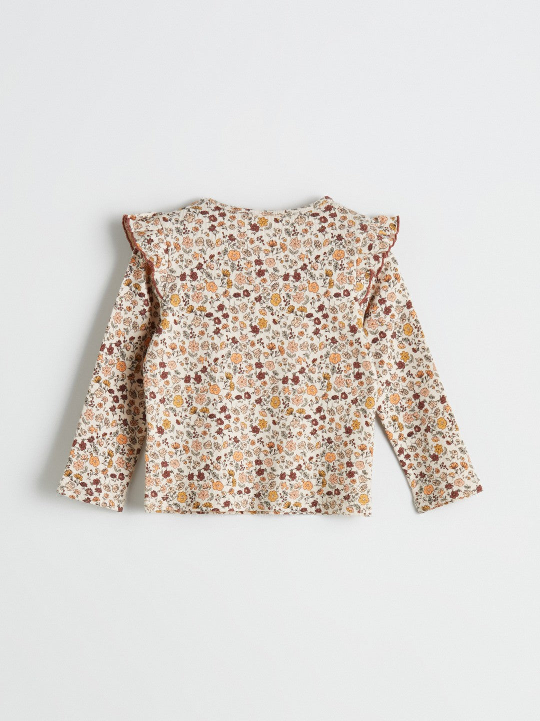 This slim-fit girls t-shirt is made of camisole fabric. It has a crew neck, long sleeves, and a floral pattern. It has ruffle details on the shoulders.