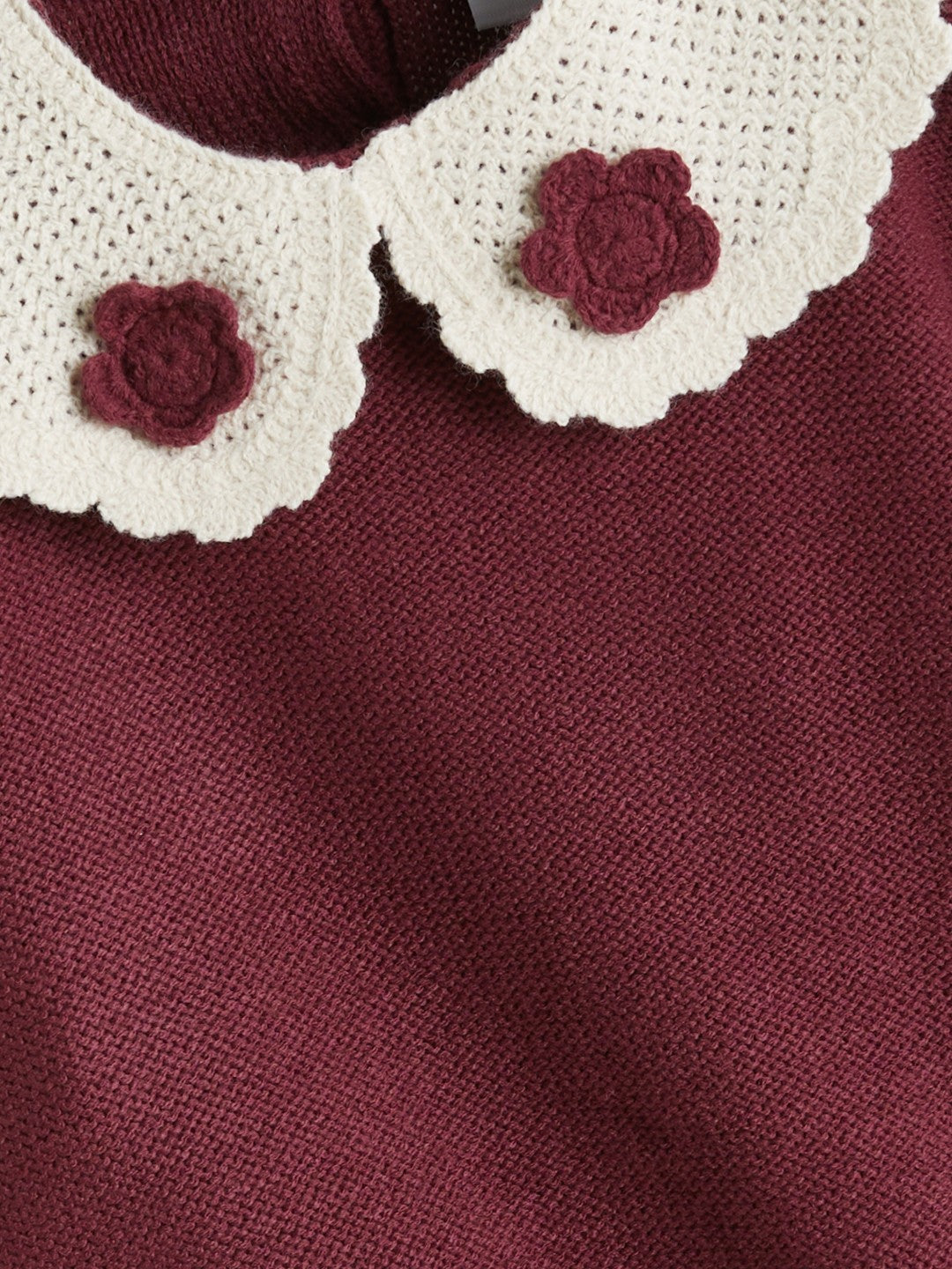 This girls knit sweater features a collar with knitted flower details. It has a button closure at the back.