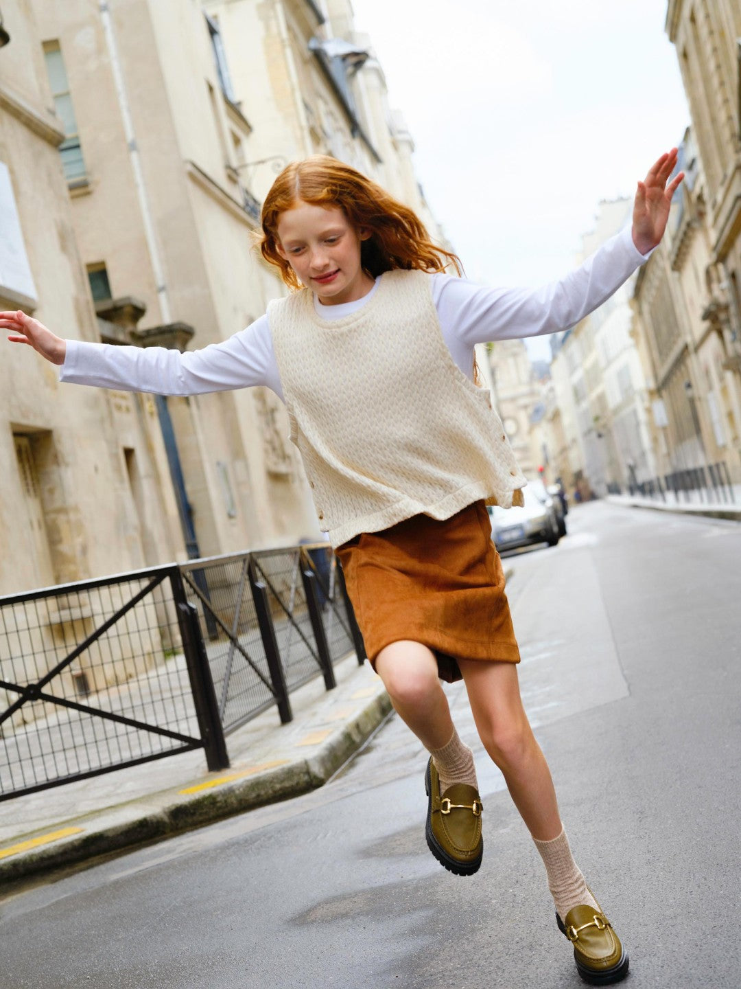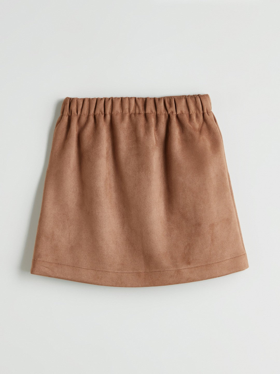 This girls skirt is made of suede fabric. It has an elastic waist, stitching details, an above-knee length design, and is unlined.