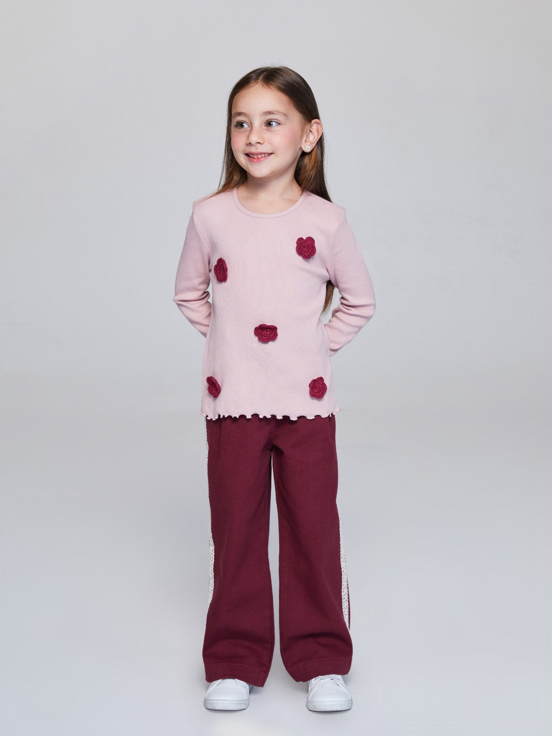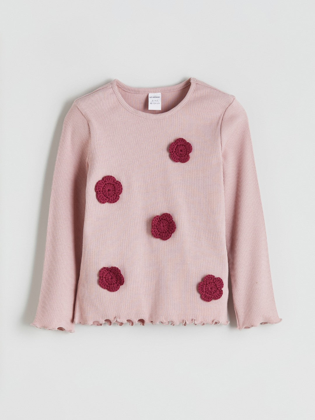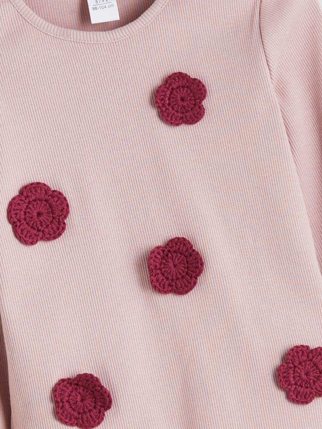 This slim-fitting girls t-shirt features a crew neck and long sleeves. The camisole fabric features knitted floral appliqués on the front.
