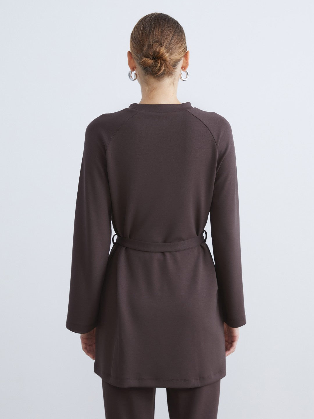 Women sweatshirt tunic with interlock fabric, crew neck, raglan cut, widening long sleeves, sash at waist and slits on the sides.