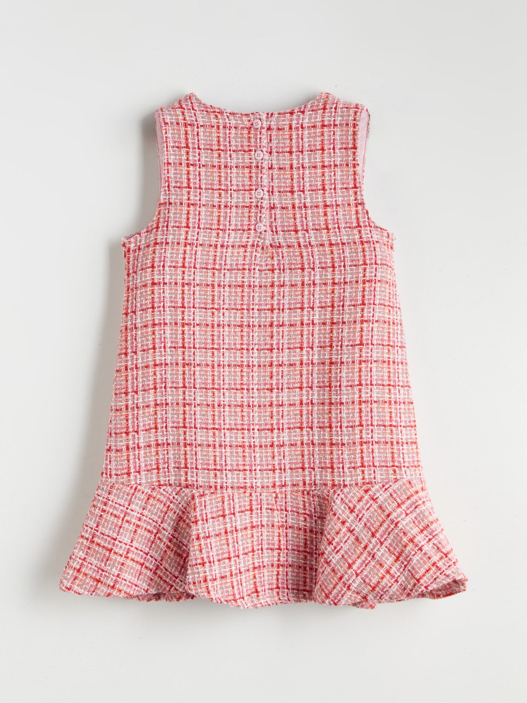 This V-neck, sleeveless girls dress is made of 100% cotton dobby fabric. It features a checkered pattern, front flap pockets, and a ruffled hem.