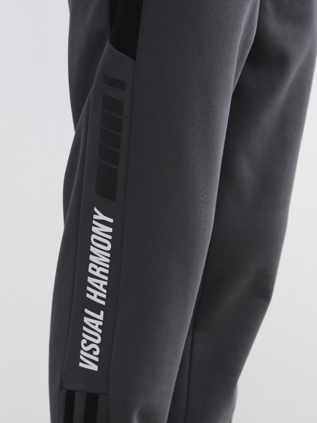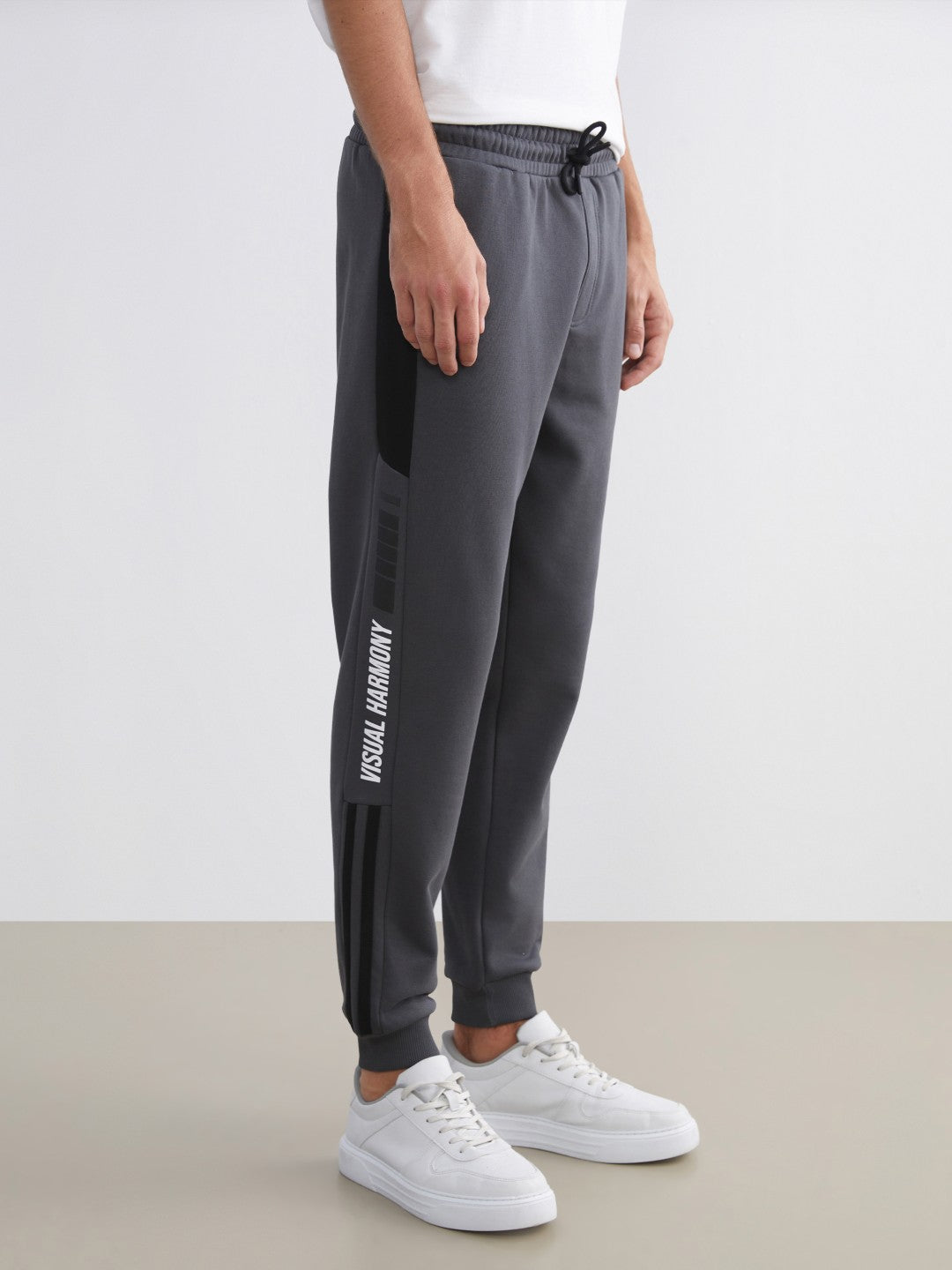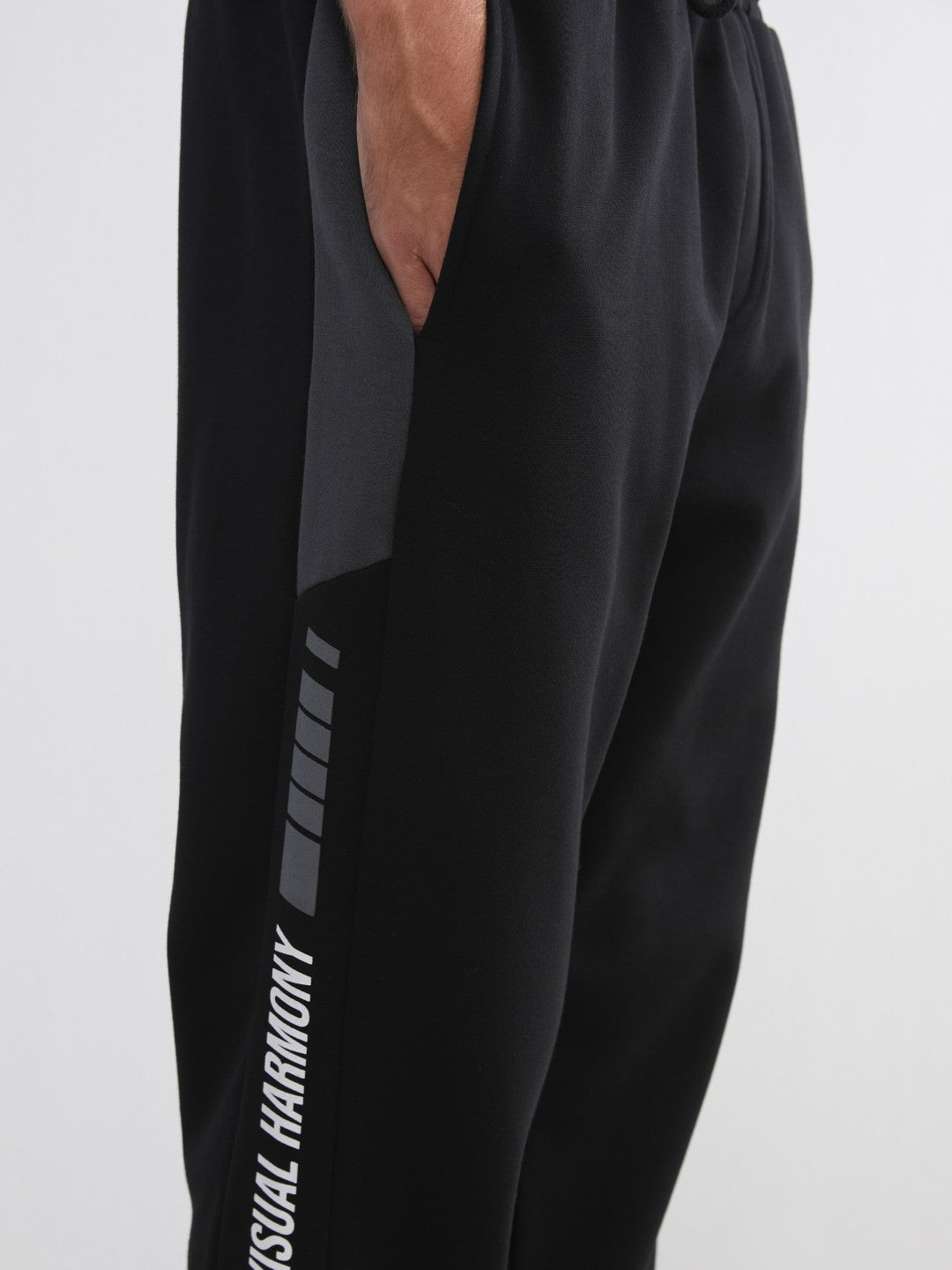 Men's sweatpants made of thick 3 thread inside brushed fabric are elastic waist and have adjustable drawstrings The sides are striped, printed, and the hems are ribbed