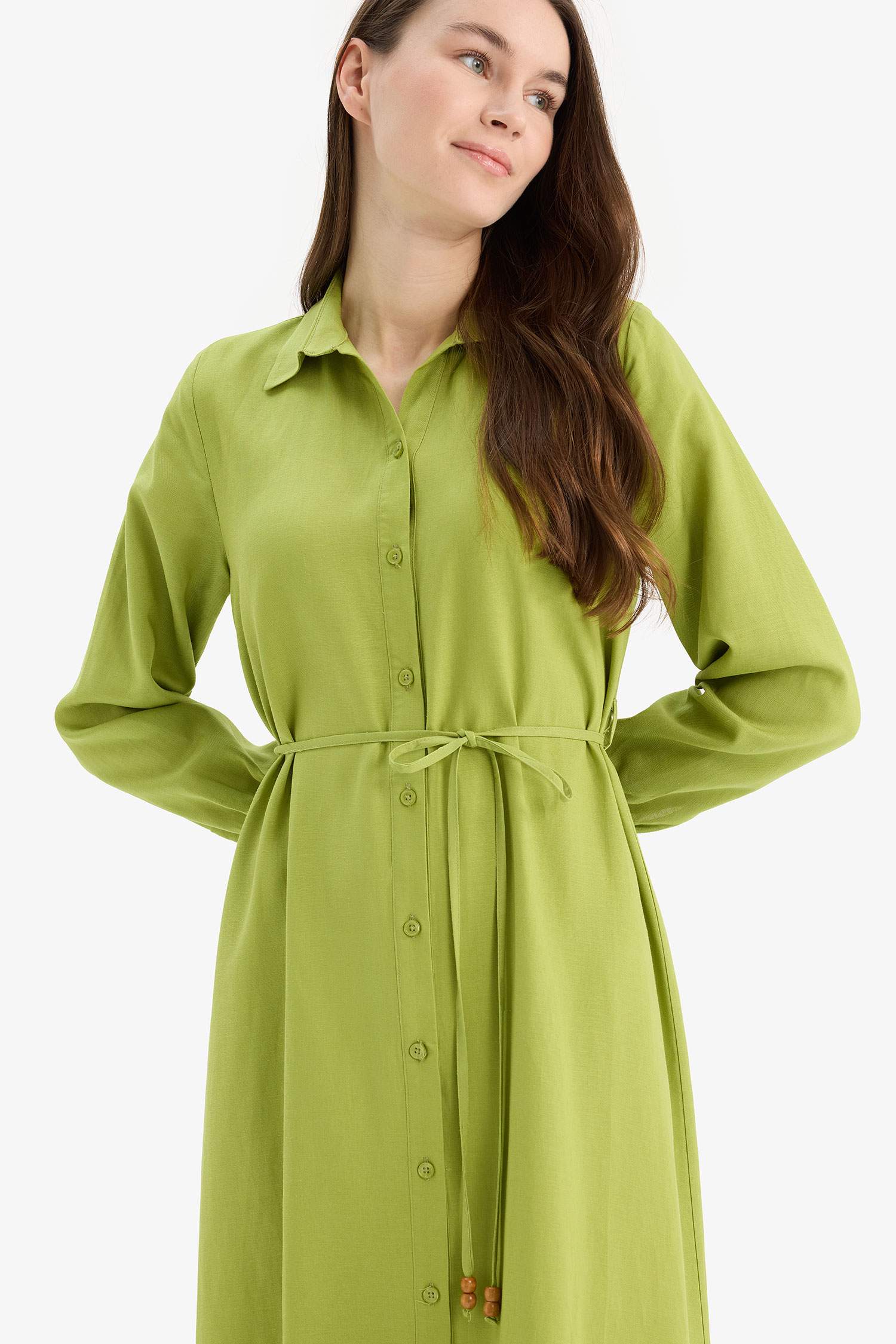 Shirt Collar Belted Linen Blend Long Sleeve Maxi Dress