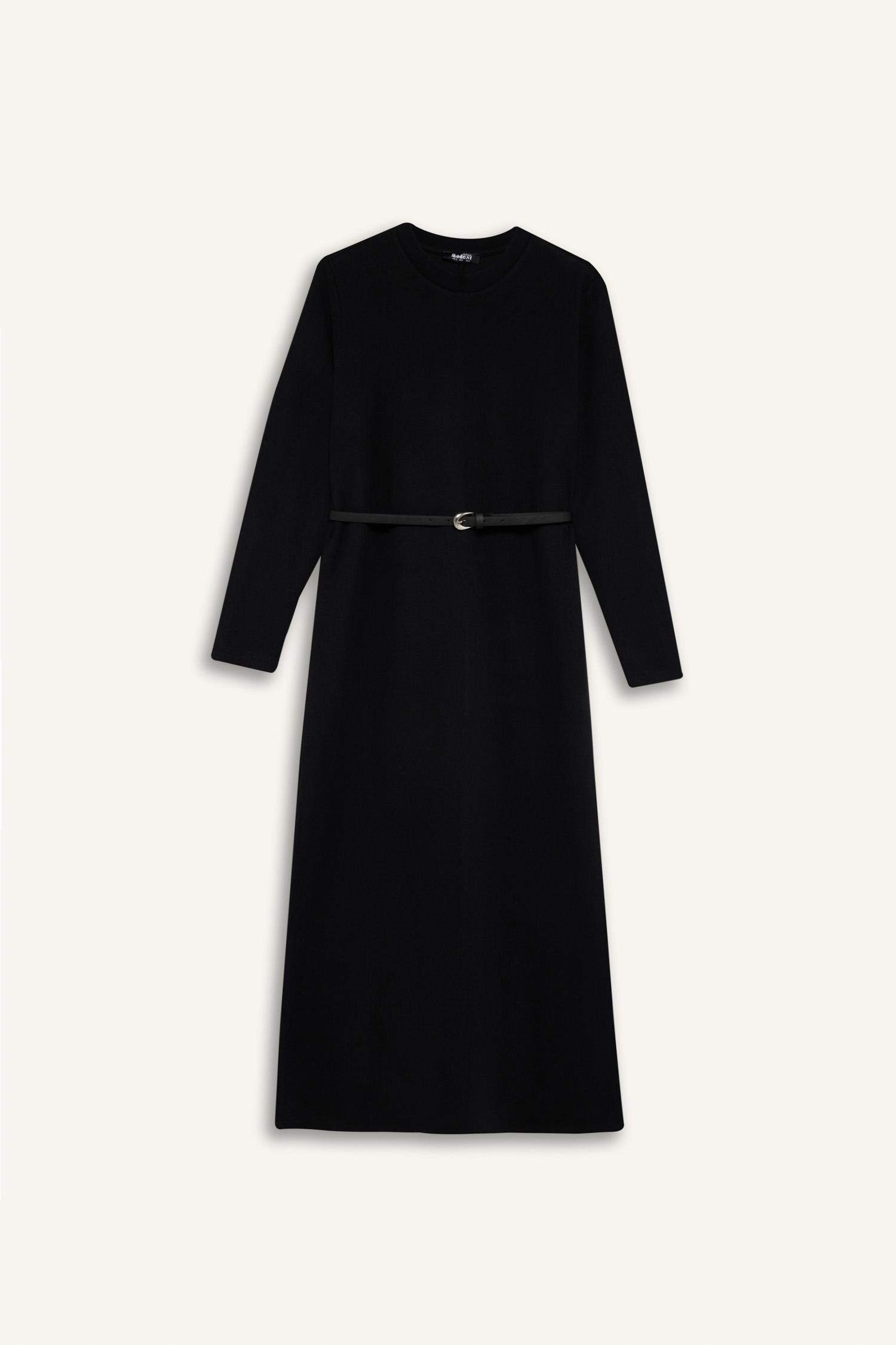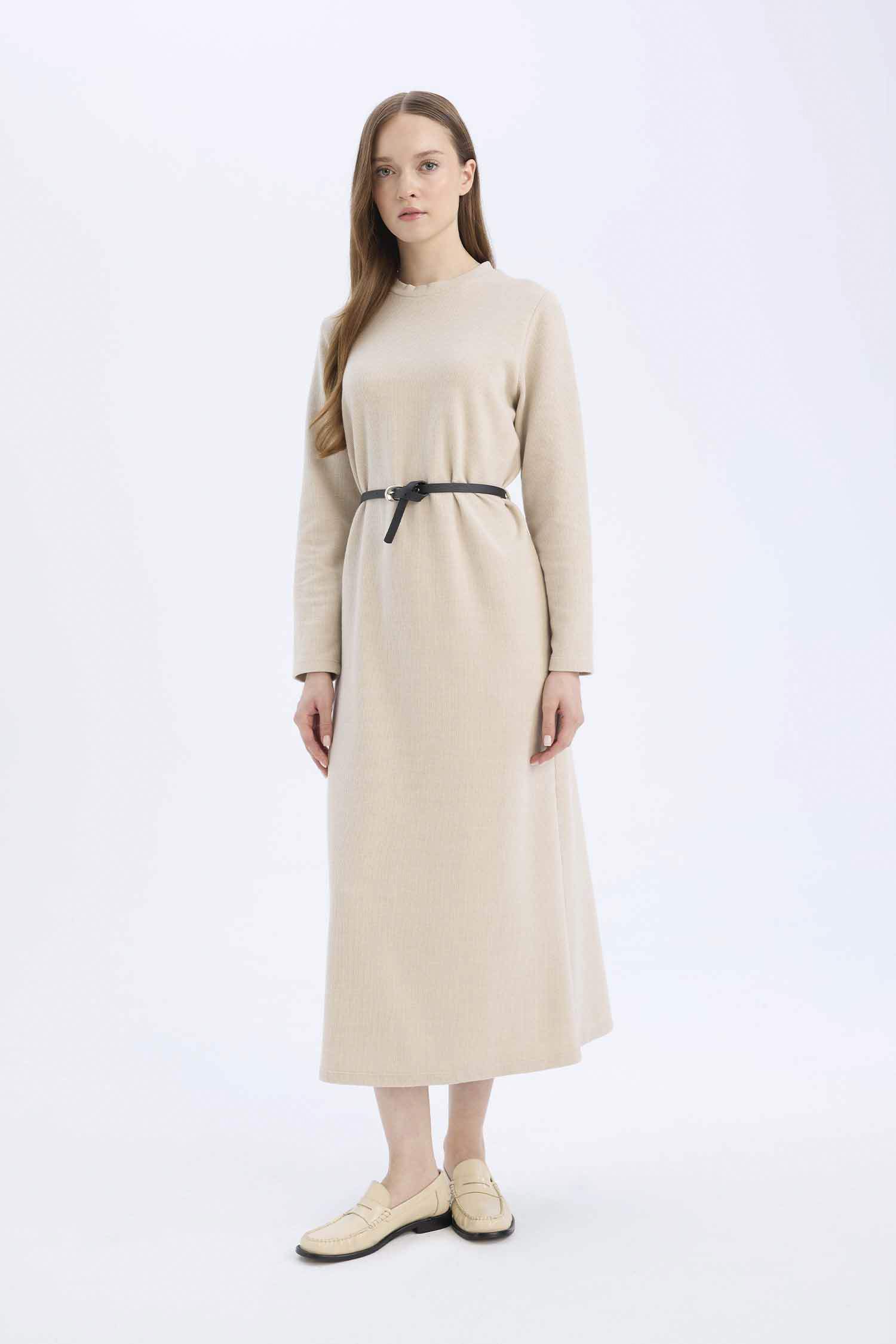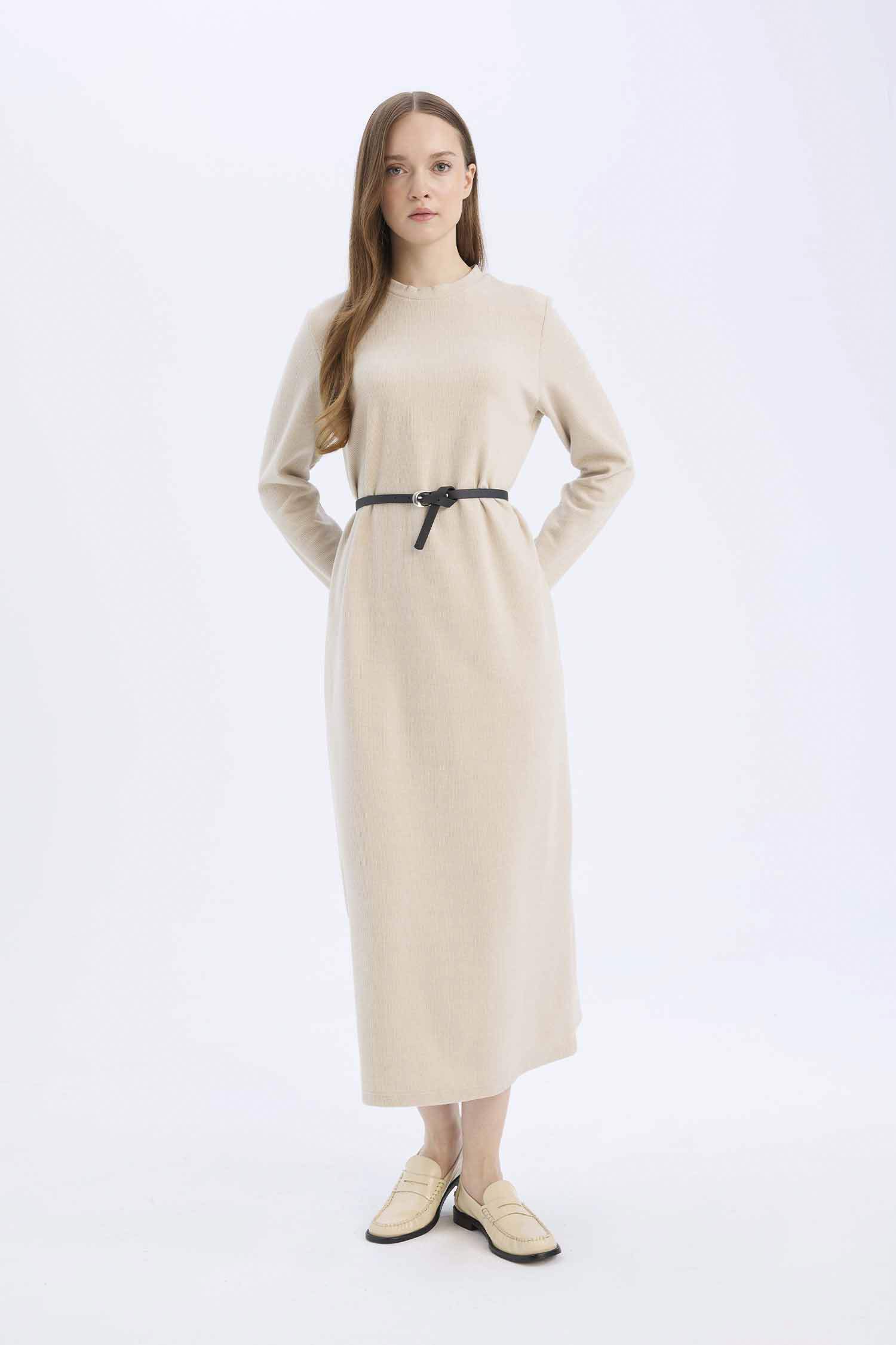 Regular Fit Crew Neck Belted Selanik Fabric Maxi Dress